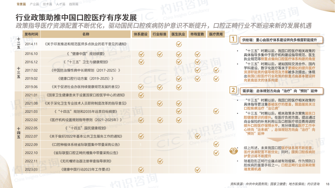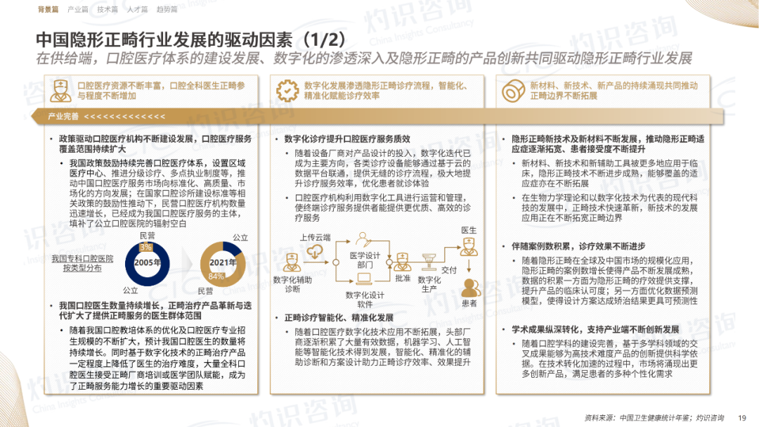 我国政策鼓励持续完善口腔医疗体系,设置区域医疗中心、推进分级诊疗、多点执业制度等,推动中国口腔医疗服务市场向标准化、高质量、市场化的方向发展;在国家口腔诊所建设标准等相关政策的鼓励性推动下,民营口腔医疗机构数量迅速增长,已经成为我国口腔医疗服务的主体,填补了公立口腔医院的辐射空白