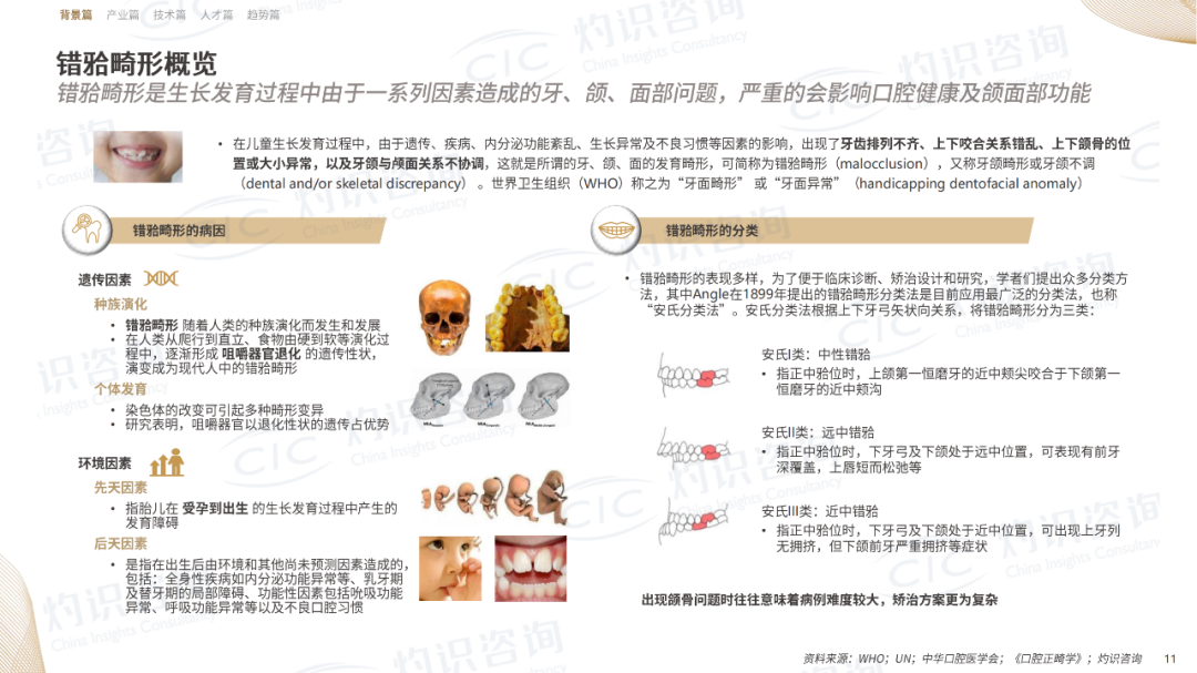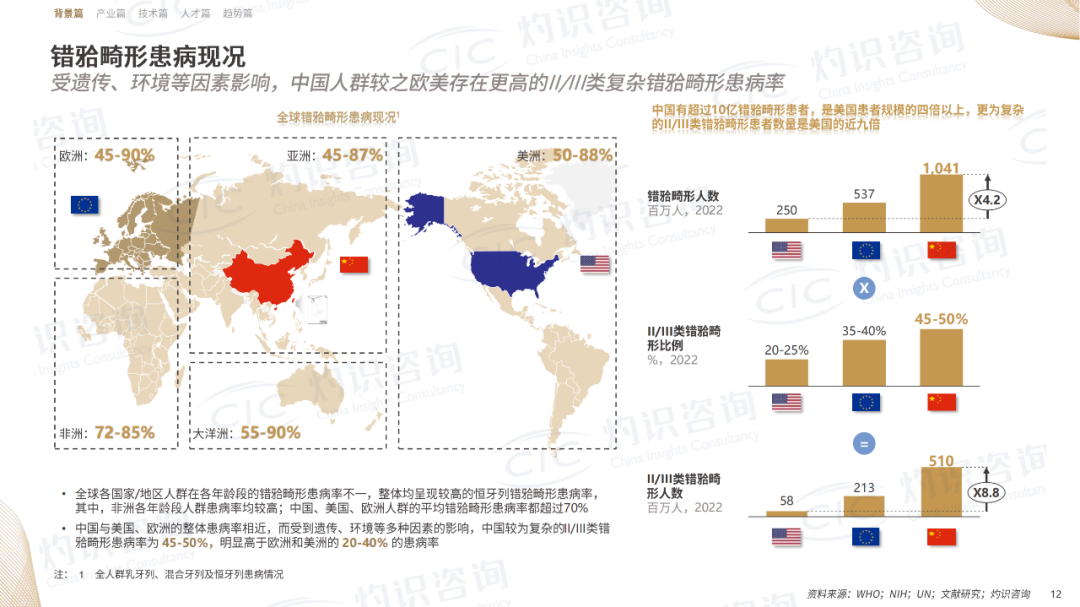 全球各国家/地区人群在各年龄段的错拾畸形患病率不一,整体均呈现较高的恒牙列错验畸形患病率,其中,非洲各年龄段人群患病率均较高;中国、美国、欧洲人群的平均错验畸形患病率都超过70%中国与美国、欧洲的整体患病率相近,而受到遗传、环境等多种因素的影响,中国较为复杂的II/III类错验畸形患病率为45-50%,明显高于欧洲和美洲的20-40%的患病率