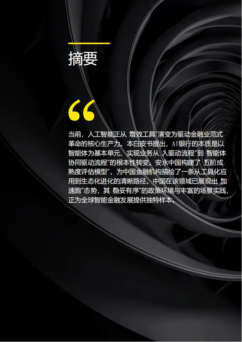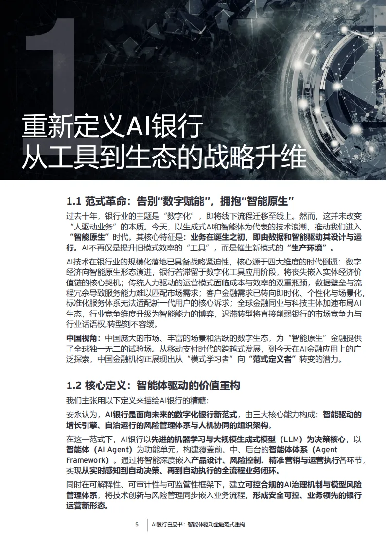 当前,人工智能正从金融行业的“增效工具”升级为驱动范式革命的核心生产力,AI银行成为金融业转型的核心方向。其本质是以智能体为基本单元,实现业务从“人驱动流程”到“智能体协同驱动流程”的根本性转变,构建“智能驱动的增长引擎+自主运行的风险体系+人机协同的组织范式”,最终成为嵌入千行百业的“智能价值单元”。