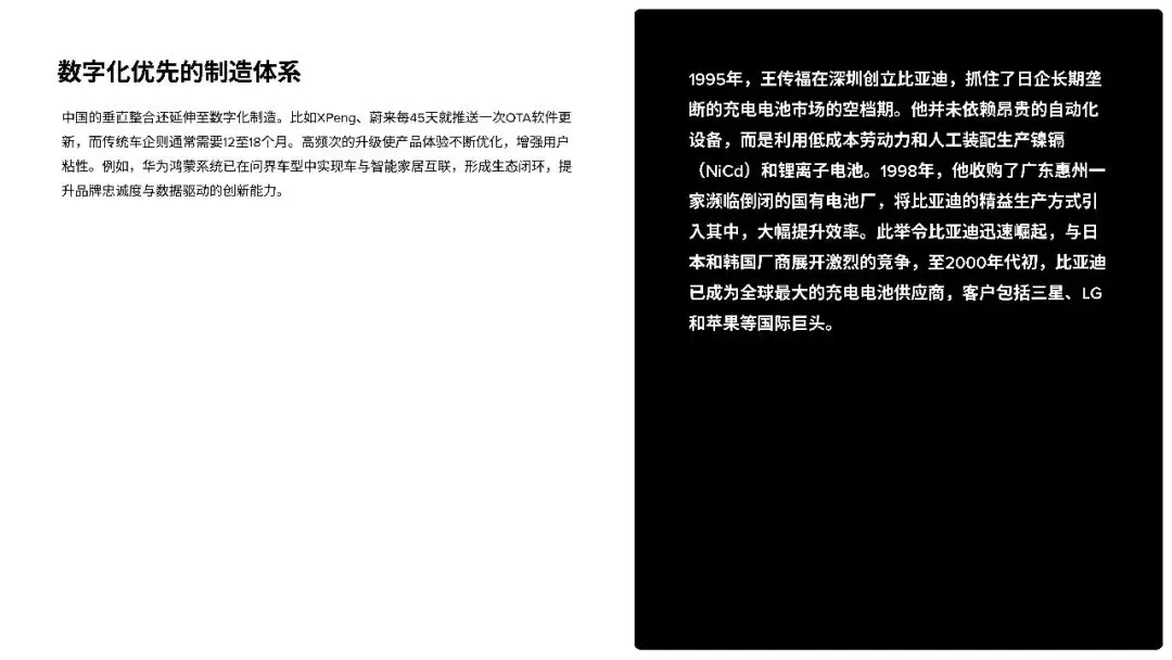 但真正的杀手锏,还是中国车企对供应链的掌控能力。以比亚迪为例,它不仅造车,还自己造电池,从锂矿开采到整车装配,牢牢控制了75%的供应链环节。这种"全产业链通吃"的模式,在过去可能被认为是"不务正业",但在电池短缺、原材料价格暴涨的今天,却显示出了强大的抗风险能力。当国外车企因为缺芯片、缺电池而不得不停工减产时,中国的电动车工厂依然能开足马力,甚至在长三角地区,400多家供应商挤在300公里的半径内,零部件两小时内就能送达生产线,这种效率是全球其他地方难以想象的。