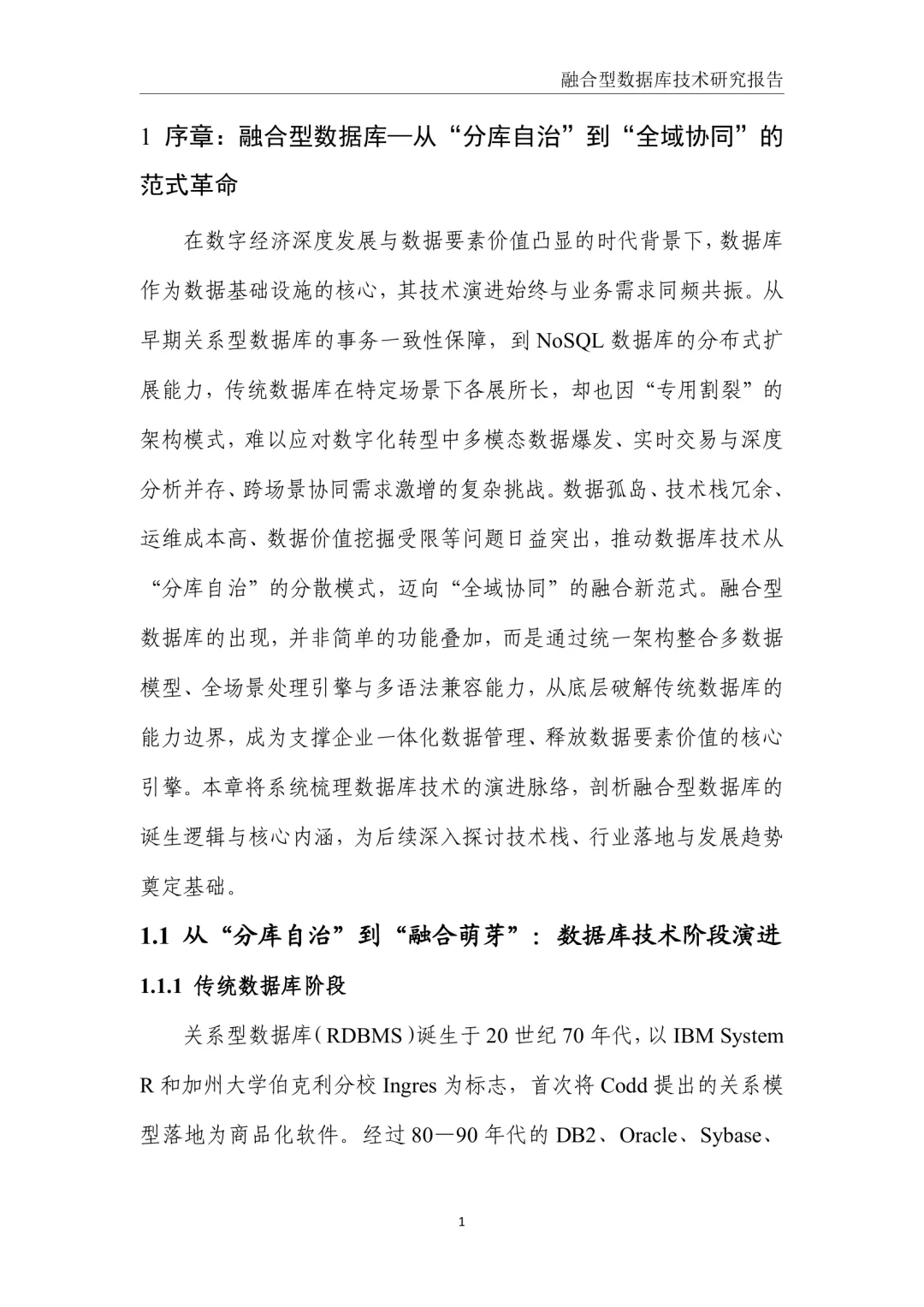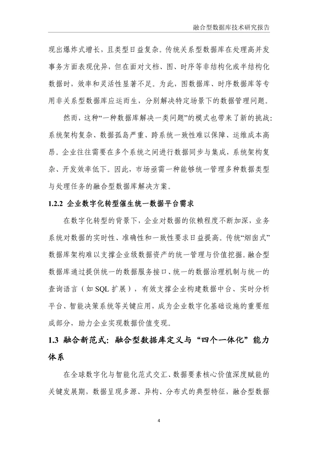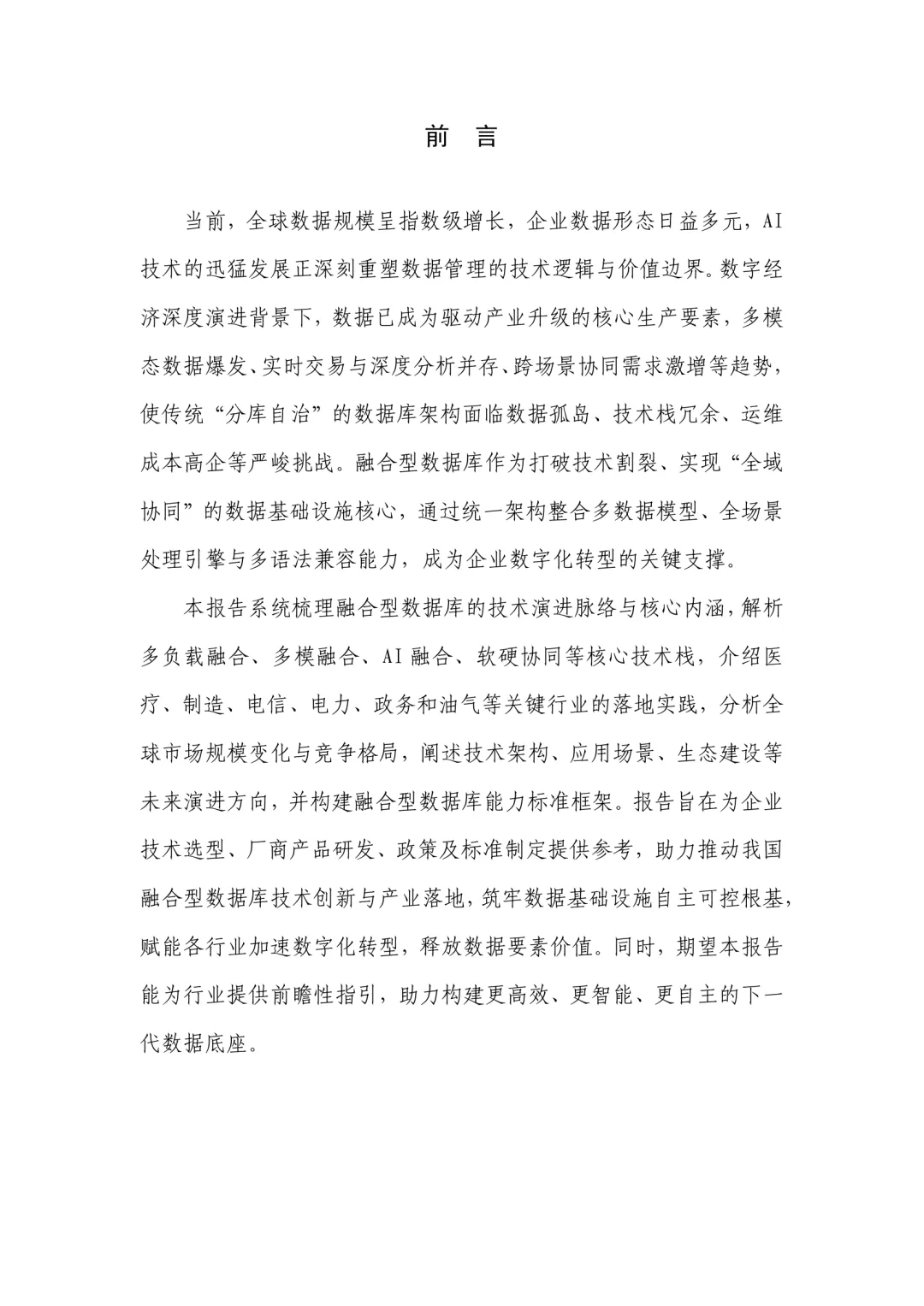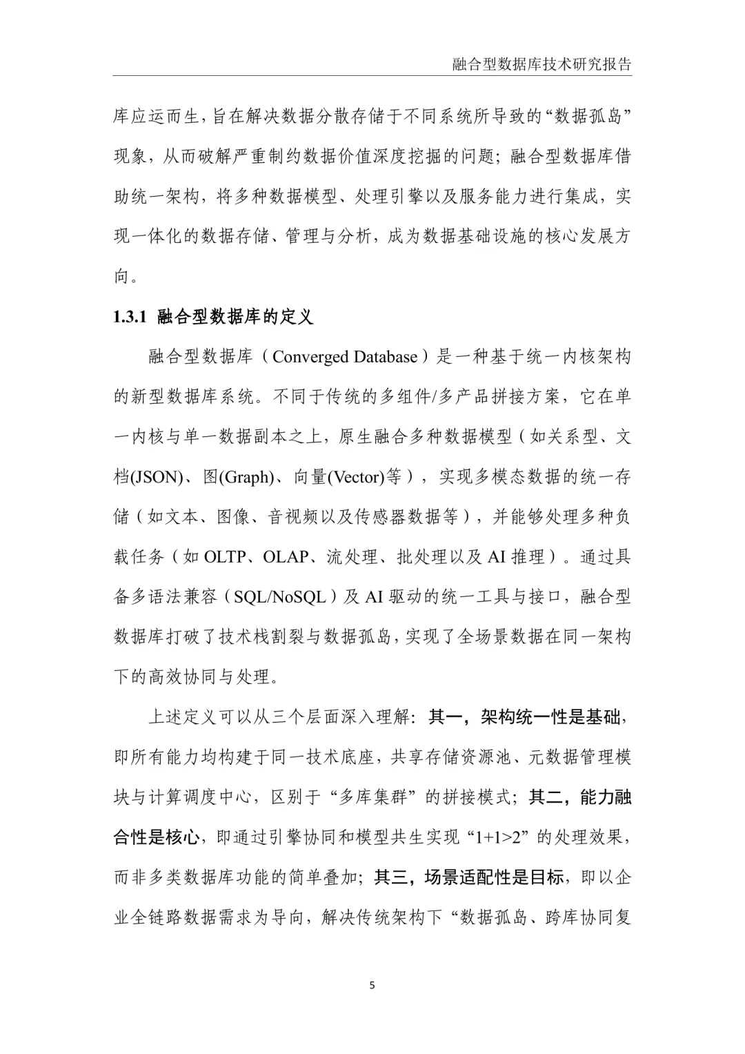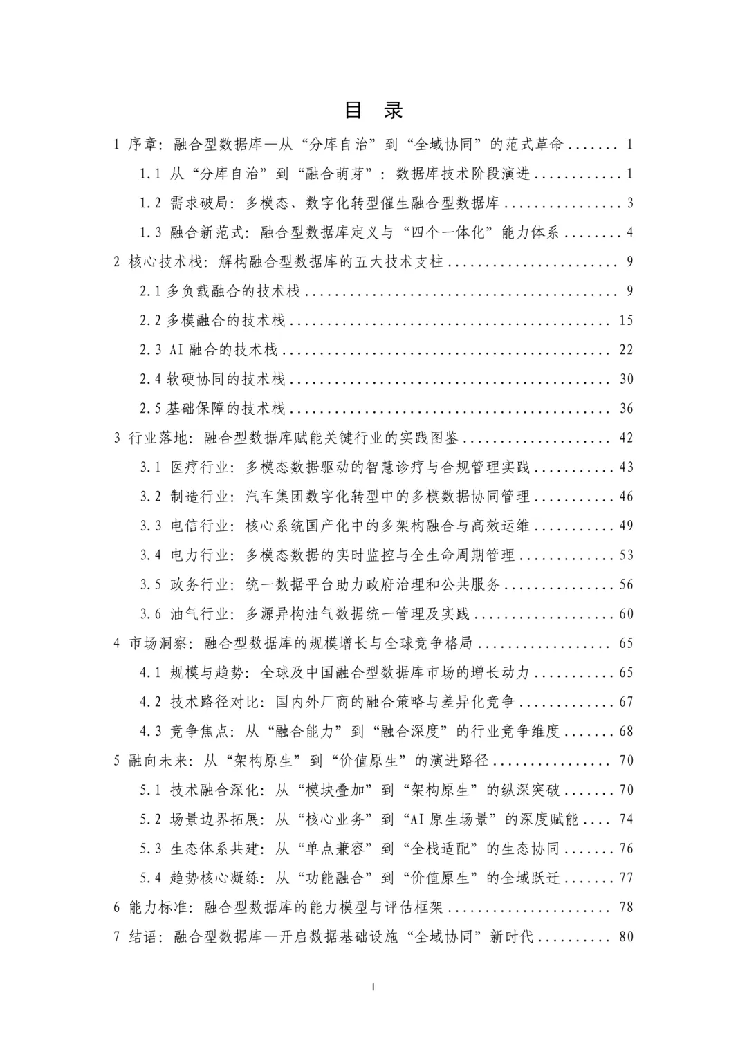 本报告聚焦融合型数据库的技术演进与实践应用,分析其在数据规模激增、AI技术发展背景下对传统数据库架构的挑战与突破。随着多模态数据、实时处理和跨场景协同需求的增长,传统“分库自治”模式暴露出数据孤岛、技术冗余和运维成本高等问题,推动了融合型数据库的兴起。该类型数据库通过统一架构整合多种数据模型、全场景处理引擎和多语法兼容能力,成为企业实现数字化转型的关键支撑。报告系统梳理融合型数据库的核心技术栈,涵盖多负载融合、多模融合、AI融合、软硬协同及基础保障五大方面,深入解析其技术逻辑与实现路径。同时,结合医疗、制造、电信、电力、政务和油气等重点行业案例,展示融合型数据库在实际应用中的价值与成效。在全球市场快速扩张的背景下,报告分析了融合型数据库的发展趋势与竞争格局,指出技术路径差异与融合深度成为行业竞争的关键维度。融合型数据库将从“架构原生”向“价值原生”演进,拓展应用场景至AI原生场景,并推动生态体系从单点兼容走向全栈适配。为规范行业发展,报告构建了融合型数据库的能力标准框架,涵盖技术能力、性能指标与评估方法,为企业选型、产品研发和政策制定提供参考。报告强调融合型数据库在数据基础设施建设中的战略意义,助力各行业提升数据治理能力,释放数据要素价值,推动数字化转型进程。