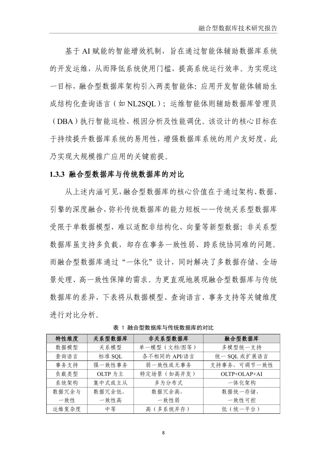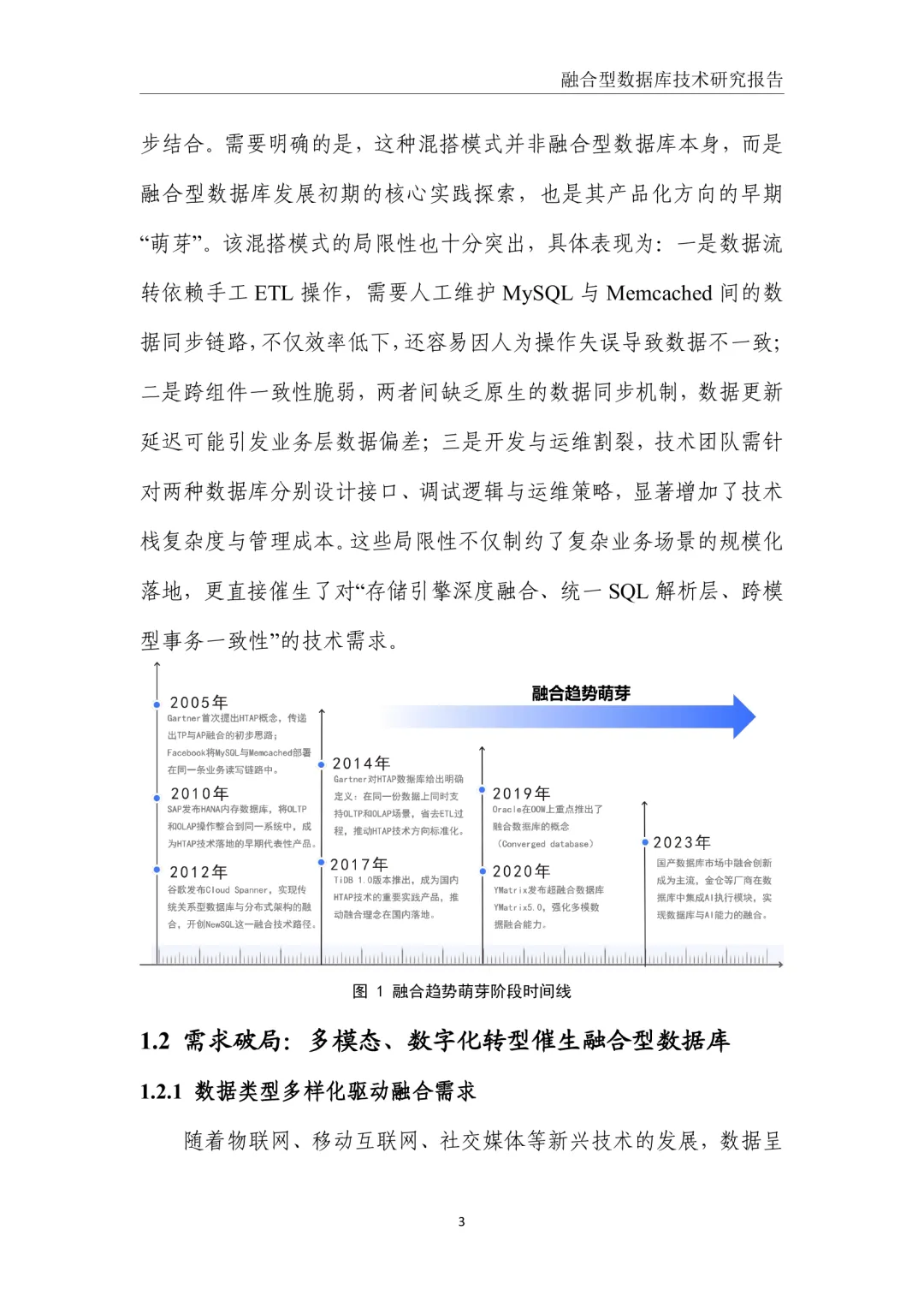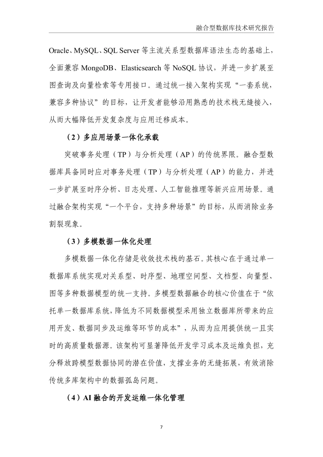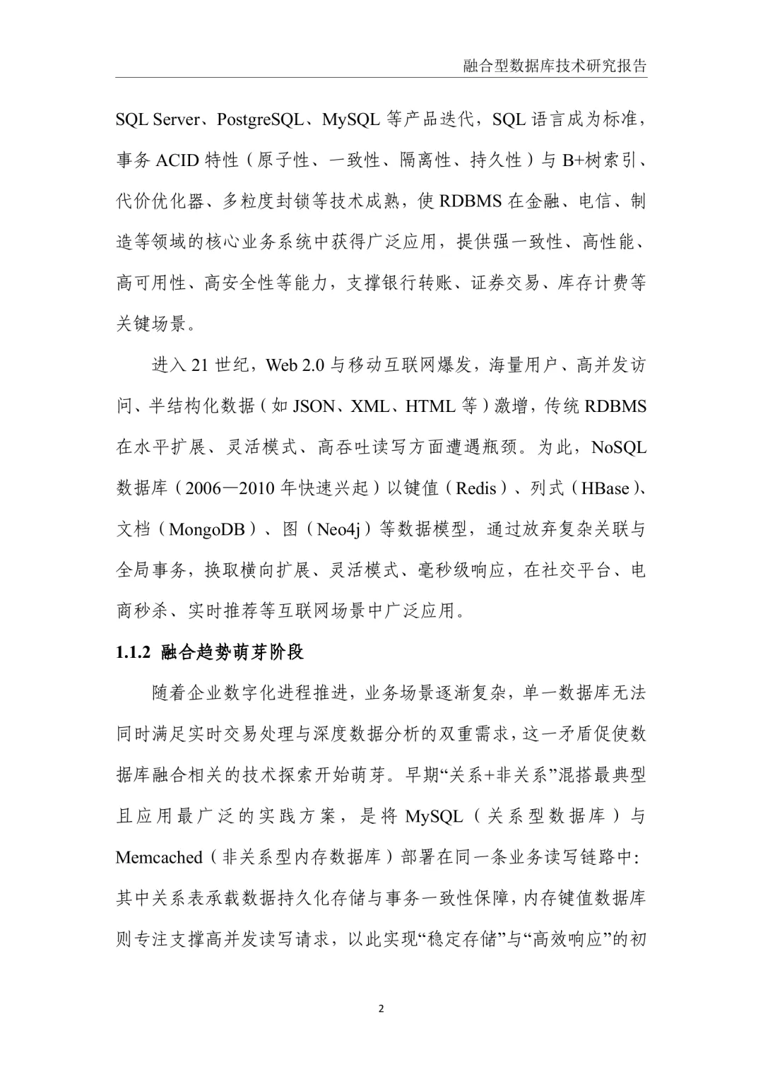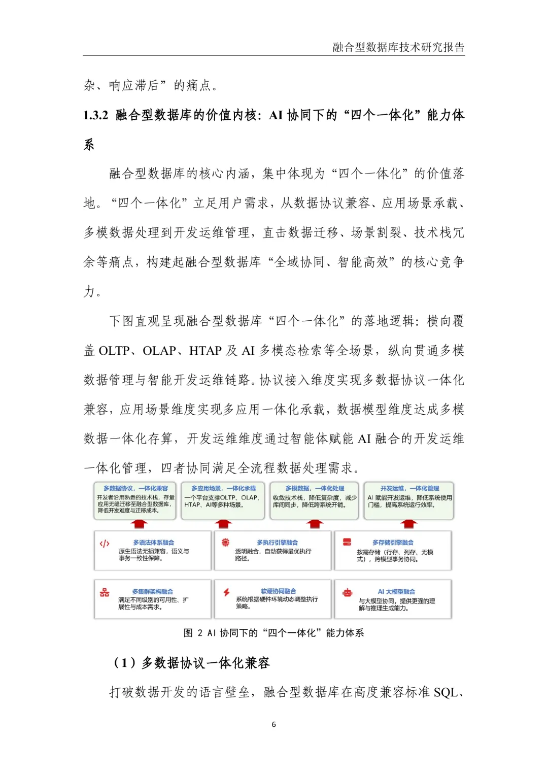 本报告聚焦融合型数据库的技术演进与实践应用,分析其在数据规模激增、AI技术发展背景下对传统数据库架构的挑战与突破。随着多模态数据、实时处理和跨场景协同需求的增长,传统“分库自治”模式暴露出数据孤岛、技术冗余和运维成本高等问题,推动了融合型数据库的兴起。该类型数据库通过统一架构整合多种数据模型、全场景处理引擎和多语法兼容能力,成为企业实现数字化转型的关键支撑。报告系统梳理融合型数据库的核心技术栈,涵盖多负载融合、多模融合、AI融合、软硬协同及基础保障五大方面,深入解析其技术逻辑与实现路径。同时,结合医疗、制造、电信、电力、政务和油气等重点行业案例,展示融合型数据库在实际应用中的价值与成效。在全球市场快速扩张的背景下,报告分析了融合型数据库的发展趋势与竞争格局,指出技术路径差异与融合深度成为行业竞争的关键维度。融合型数据库将从“架构原生”向“价值原生”演进,拓展应用场景至AI原生场景,并推动生态体系从单点兼容走向全栈适配。为规范行业发展,报告构建了融合型数据库的能力标准框架,涵盖技术能力、性能指标与评估方法,为企业选型、产品研发和政策制定提供参考。报告强调融合型数据库在数据基础设施建设中的战略意义,助力各行业提升数据治理能力,释放数据要素价值,推动数字化转型进程。
