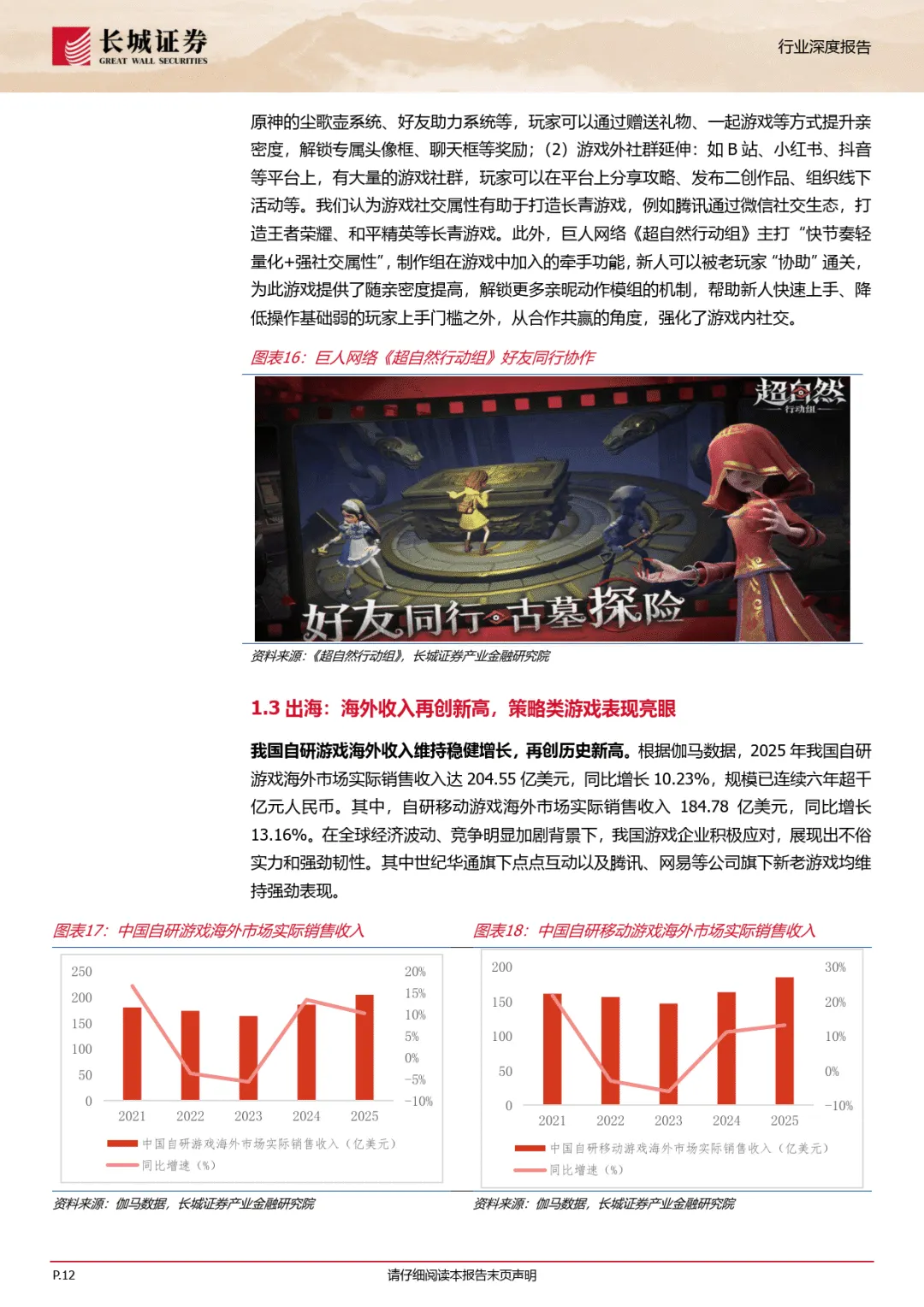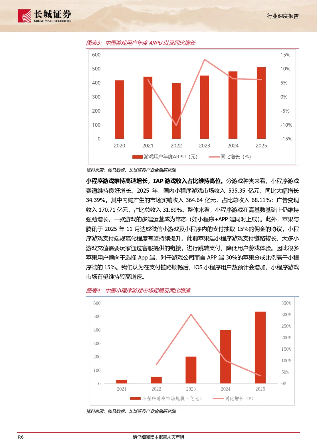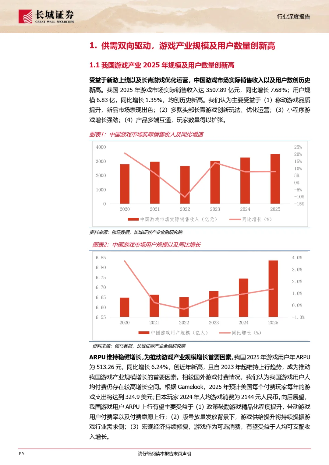 2025 年我国游戏产业表现亮眼,市场实际销售收入达 3507.89 亿元,同比增长 7.68%;用户规模 6.83 亿,同比增长 1.35%;年 ARPU 达 513.26 元,同比增长 6.24%,三项数据均创历史新高。与美日等国相比,我国游戏用户人均付费仍有较大增长空间,未来有望受益于政策推动、版号放量及宏观经济修复。————