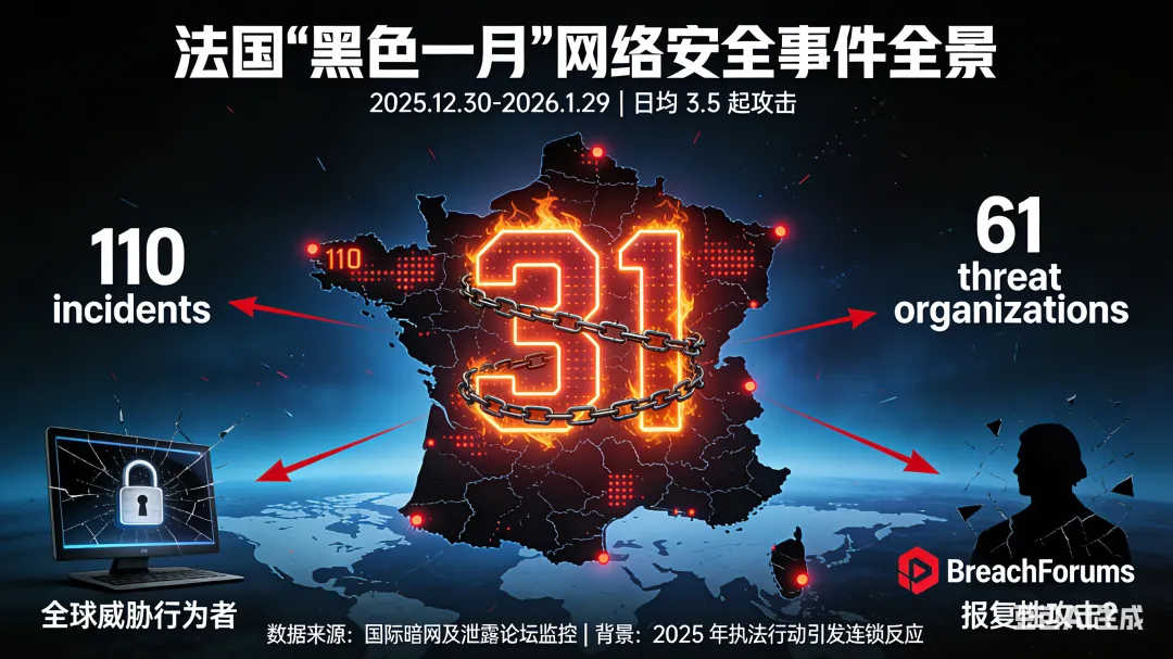 引言2026年的第一个月,法国的网络空间并未迎来新年宁静。在过去短短31天(2025年12月30日至2026年1月29日)里,来自全球的威胁行为者在这片数字战场上发动了密集攻击。根据对国际主流暗网及数据泄露论坛的持续监控,我们共记录到110起针对法国实体的网络安全事件,平均每天超过3.5起。这些事件涉及61个不同的威胁行为者,泄露的数据总量触目惊心,从公民个人信息到关键基础设施机密无所不包。本文将深入解析这场“黑色一月”的整体态势、核心黑手、典型攻击,并揭示完整的事件时间线。
