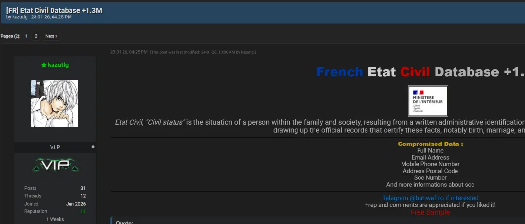 darkforums.io论坛公开发布声称窃取自法国政府的户籍数据库,涉及130万条记录。泄露数据可能包含公民姓名、出生日期、地址、家庭关系等最核心的身份信息。影响分析:这是对国家核心人口管理系统的直接攻击。此类数据是身份欺诈的“原料”,可被用于注册虚假身份、突破金融安全验证、进行精准政治或商业间谍活动,危害深远且难以补救。
