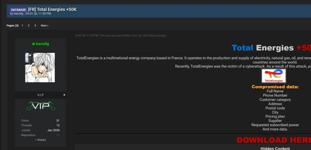 案例二:道达尔能源(TotalEnergies)数据库泄露(2026年1月24日)