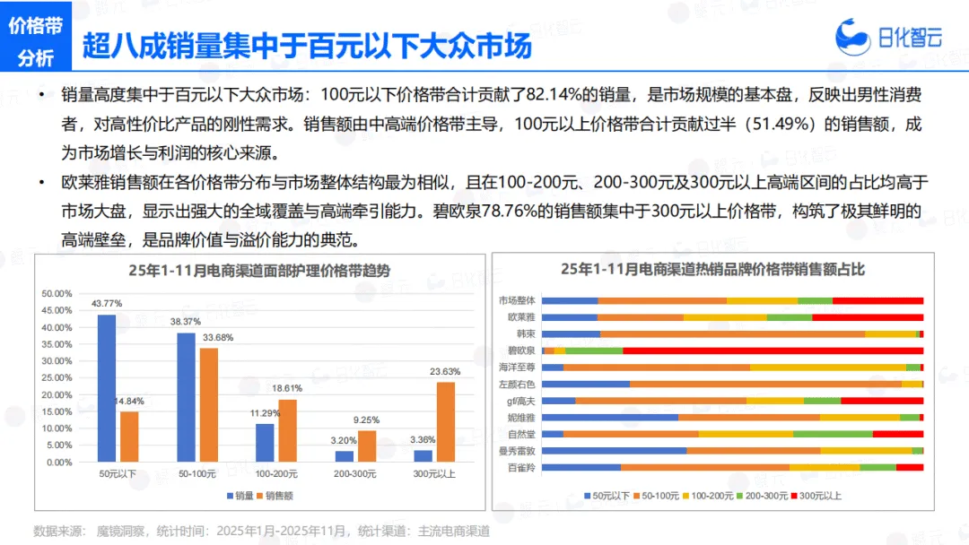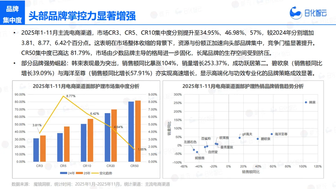 市场整体呈现收缩态势,2025年1-11月销量微增2.01%,销售额却同比下滑16.11%,大促拉动效应减弱,消费者支付意愿趋谨慎。细分品类表现分化,面部护理以87.63%的市场份额为基本盘,但销售额同比下滑18.74%;头发洗护逆势高增,销售额与销量同比分别激增177.43%和182.03%;身体护理份额仅4.59%,且销量、销售额降幅均超46%。供给端降温明显,三大类目备案产品数与品牌数齐跌,行业同质化供给加速出清。