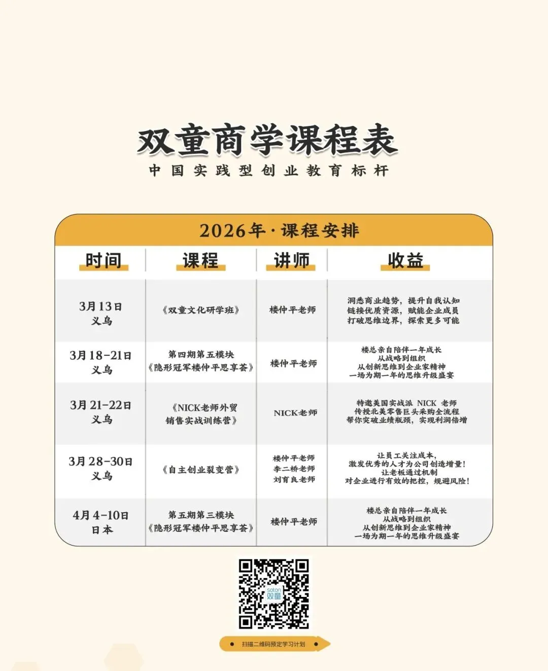作为由楼仲平创立、扎根制造业的实战型商学平台,双童商学依托双童从草根作坊到全球行业隐形冠军的实战积淀,摒弃空泛理论,为中小民企量身打造可落地、可复制的经营解决方案。