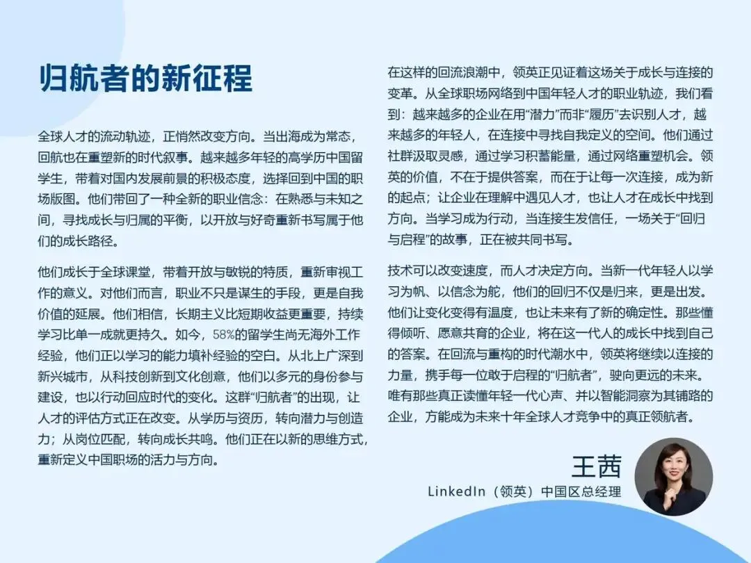 领英依托全球人才数据与深度调研,正式发布《2025中国留学生归国求职洞察报告》。本报告聚焦新一代海归群体的求职选择、技能优势与职业发展方向,深入解析在产业升级与人才政策双重驱动下,企业用人需求的演变与引才策略的调整。我们期望通过数据洞察,为企业和机构在关键发展时期提供精准、前瞻的人才决策支持,促进高层次人才与国家战略、市场机遇的高效衔接与共同成长。