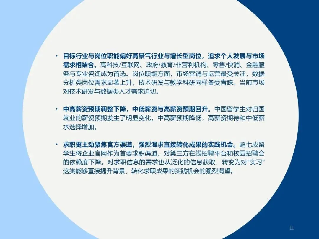 留学生群体呈现高学历化与年轻化特征,硕士学历占比持续提升,专业选择更趋多元。高度重视企业的全球化潜力与岗位的长期价值;增长驱动与数据分析类复合岗位因其发展前景受到青睐。面对留学生求职周期前置、信息渠道偏好官方化等趋势,企业应着力强化雇主品牌建设,突出技术创新实力与清晰的职业发展路径,以有效吸引并留住具备国际视野的归国人才。