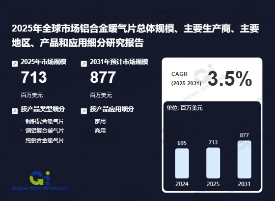 据GIR(Global Info Research)调研显示,2024年全球铝合金暖气片市场规模约为6.95亿美元,销量达到约1500万片,平均单价约为每片45美元。预计至2031年,该市场规模将增至8.77亿美元,期间年复合增长率(CAGR)为3.5%。这表明尽管增速相对温和,但市场需求持续稳定上升,反映出消费者对高效能、环保型取暖设备的青睐。