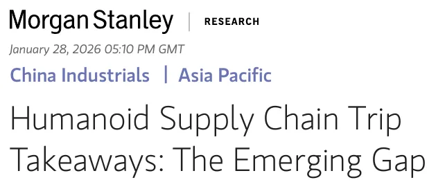 随着人形机器人行业从视频演示转向真实出货与应用验证,2026年被视为商业化落地的关键一年 。摩根士丹利本次考察涵盖了傅利叶、开普勒、魔法原子等主流集成商,以及以绿的谐波、恒立液压为代表的核心零部件供应商 。报告指出,行业内部正出现明显的“贫富差距”,领先企业在任务能力、量产经验和供应链渗透率上已逐渐拉开与追随者的距离 。