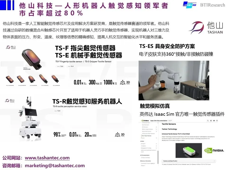 技术瓶颈与多样化竞争: 尽管硬件进步迅速,但受限于模型、数据和算力,机器人操纵能力的提升相对缓慢;此外,在触觉传感器等关键环节,技术路线(压阻、电容、霍尔效应)仍处于碎片化竞争阶段 。