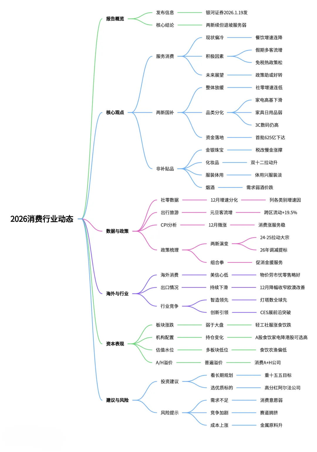 核心观点是:“两新”(大规模设备更新和消费品以旧换新)政策的国家补贴在2026年得以延续,但服务消费虽有望改善却仍显疲软,整体消费呈现 “乍暖还寒” 的态势。