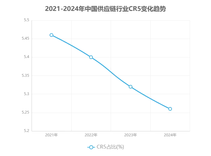 行业集中度变化趋势:2021-2024年期间,中国供应链行业CR5(前五企业市场集中度)从5.46%下降至5.26%,呈现缓慢下行趋势。这一数据表明行业"马太效应"有所减弱,头部企业市场份额增长乏力,行业竞争格局面临重构。