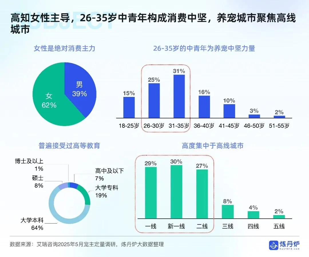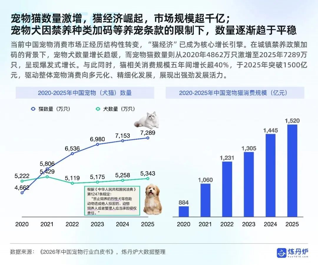 中国宠物市场正经历从“养育动物”到“抚育家人”的深刻身份革命,驱动市场规模向4000亿元迈进,其增长内核已从基础生存消费,全面转向以健康预防、情感体验和科技赋能为特征的“精致化、全生命周期管理”。2025年宠物猫数量激增至7289万只,相关消费突破1500亿元,主导“猫经济”崛起;宠物消费中,老年期专用主粮销量激增,保健品增速亮眼;同时,“看病贵”和“宠物拆家”位列核心痛点,而“人宠共居”趋势下,近六成宠主已将宠物纳入长期生活规划。