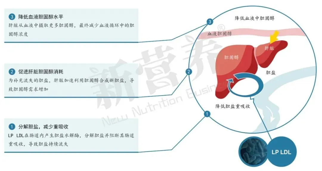 胆固醇平衡的机制 VasoNex™唯馨康®植物乳植杆菌LP LDL的核心机制在于其能够产生四种不同的胆汁盐水解酶(BSH)[2-4]。这些酶会分解肠道内的结合型胆汁酸,使其无法被重吸收进入肝脏。为了维持胆汁酸的平衡,肝脏不得不动用更多的胆固醇来合成新的胆汁酸,从而有效降低血清胆固醇水平。这一过程无需抑制肝脏酶活性,避免了肝脏损伤风险。