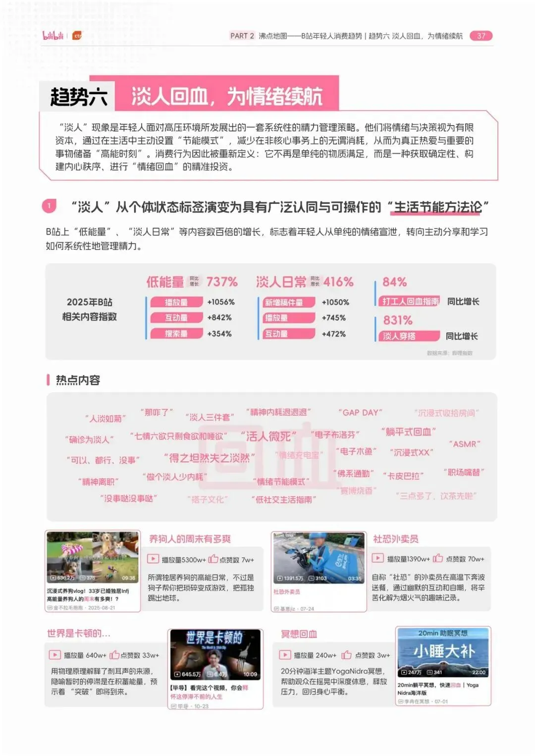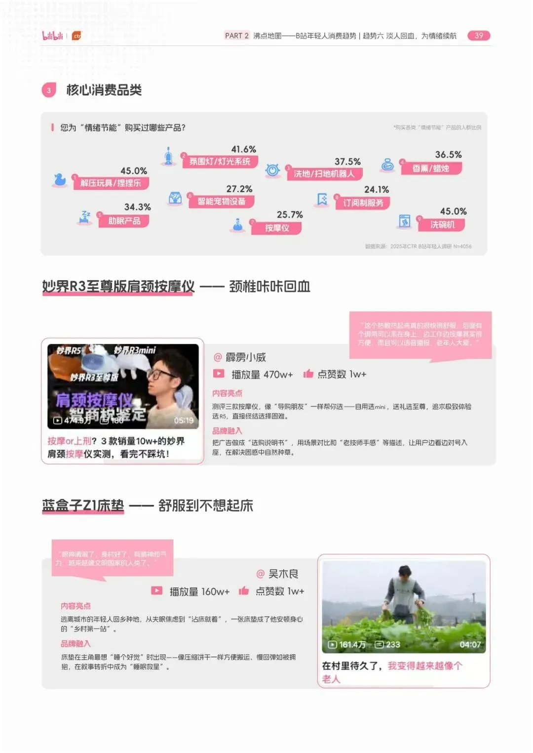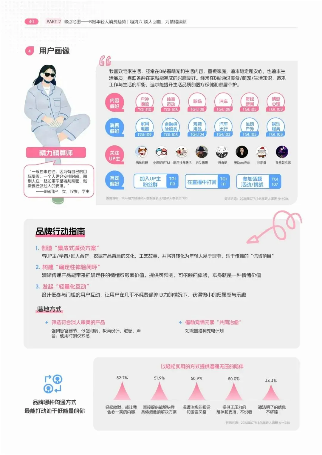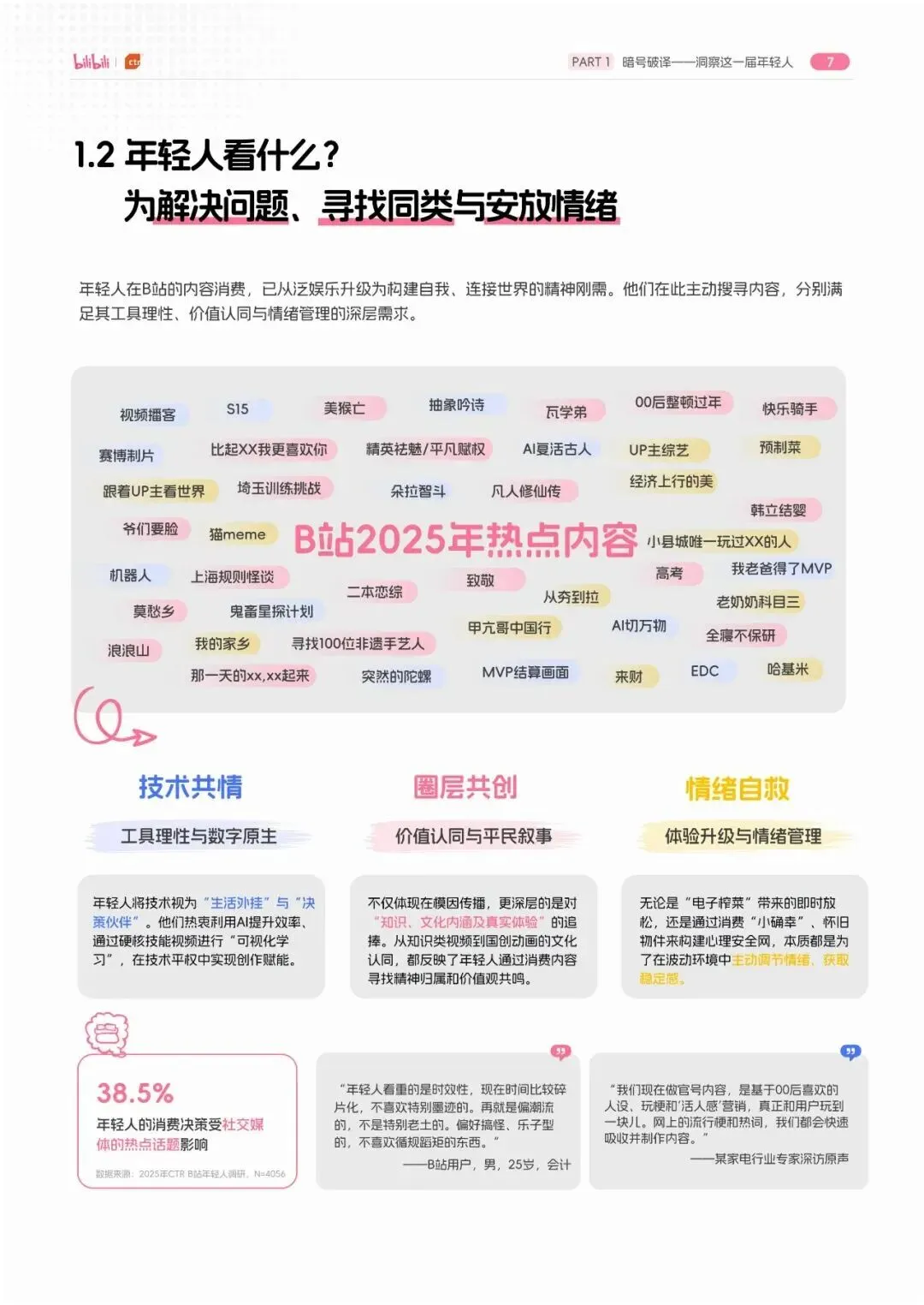 报告通过对2025年B站热点内容的分析,挖掘出当代年轻人三大共性深层需求:获取解决方案的工具理性、寻求共鸣的价值认同、管理情绪的精神安放。这些需求是品牌洞察年轻心智、建立消费共识的关键要素。