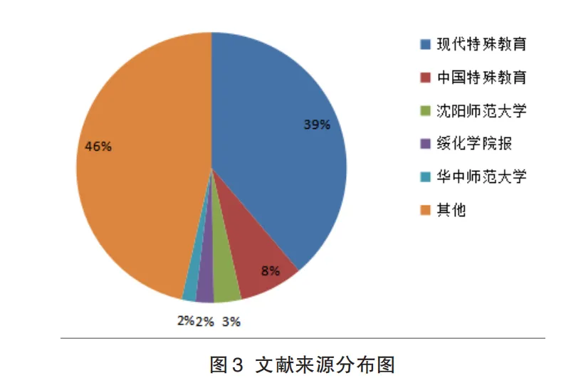 文献来源分布图(见图3)显示,文献的主要五大来源分别是《现代特殊教育》、《中国特殊教育》、沈阳师范大学、《绥化学院报》、华中师范大学,文献来源占比分别是39%、8%、3%、2%、2%。文献的主要来源是《现代教育期刊》和《中国特殊教育》期刊,这两大期刊都是特殊教育领域的权威性期刊。沈阳师范大学、绥化学院以及华中师范大学也对特殊教育学校职业教育开展了深入的研究。通过对文献来源的分析,说明当前特殊教育学校职业教育的研究已经取得了一定的高度,有一定的学术影响力。