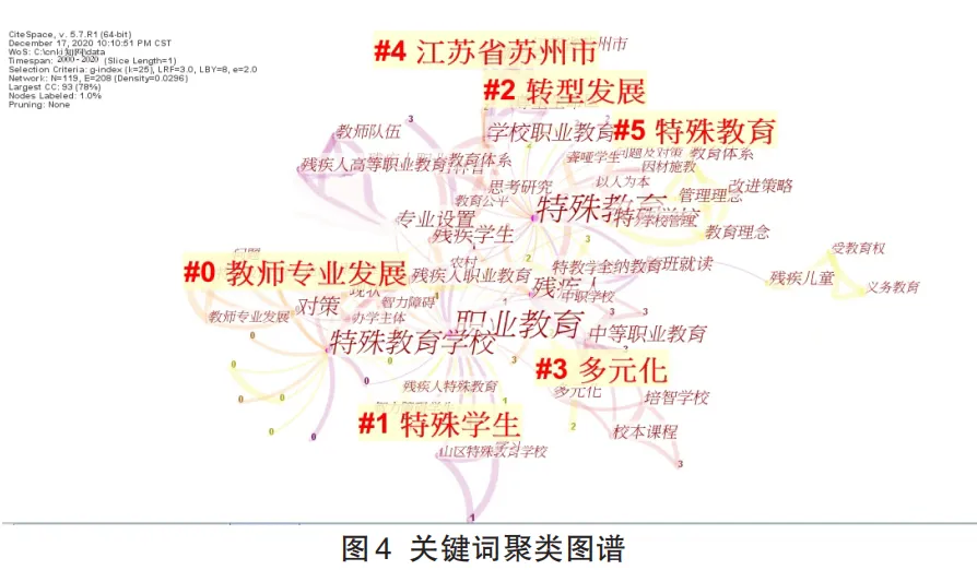 时间切片设置成1年,网络节点选择key-word,生成关键词聚类图谱(见图4)。关键词共有119个,208条边,网络密度是0.0296,大于机构合作网络的密度,但是关键词网络密度还应进一步提升,关键词网络结构是比较松散的。Citespace软件基于对关键词的统计,提炼出了以下聚类:教师专业发展、特殊学生、转型发