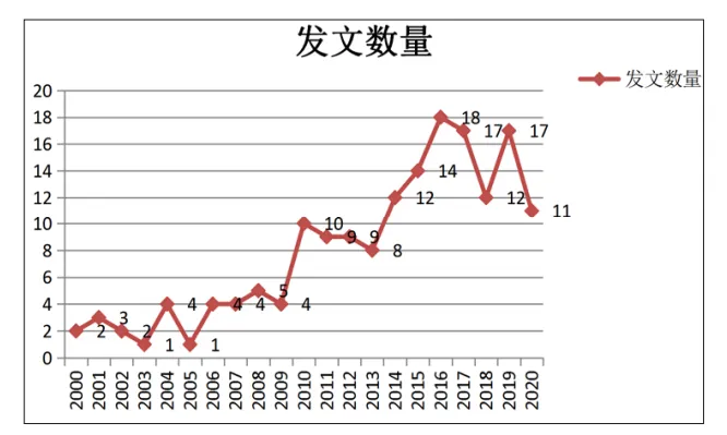 本文统计了2000年至2020年关于特殊教育学校职业教育文献的发表数量,得出特殊教育学校职业教育研究文献时序分布图(见图1)。特殊教育学校职业教育研究的相关文献总体呈上升的趋势。2000年至2003年的产出文献都在3篇以内,相对较少。从2003年开始文献产出开始小幅增加,主要原因可能是2002年《国务院关于大力推进职业教育改革和发展的决定》为特殊教育学校职业教育的研究提供了相关的政策支持。2010年后,文献产出增长尤为迅速,《国家中长期教育改革和发展纲要(2010-2020)》、2014年《国务院关于加快发展现代职业教育的决定》、2016年《“十三五”加快残疾人小康进程规划纲要》、2017年新修订的《残疾人教育条例》、2018年《关于加快发展残疾人职业教育的若干意见》、2020年“十四五”规划等政策、文件相继出台,都为特殊教育学校职业教育的发展提供了支持,加快了特殊教育学校职业教育的发展。从总体趋势上来看,特殊学校职业教育将继续成为研究者研究的热点领域。