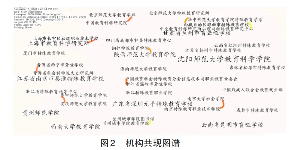 以特殊教育学校职业教育为主题发文量较多的机构(见图2)有沈阳师范大学教育科学院、陕西师范大学教育学院、南京特殊教育师范学院、贵州师范学院、北京师范大学教育学部、西南大学等。同时,图2展现了我国特殊教育学校职业教育研究领域各机构之间的合作情况。如图2显示,该知识图谱共有109个机构,10条边,网络密度是0.0017,网络密度较小,结构较松散。这说明国内特殊教育学校职业教育领域的研究团体分散,相互之间的合作较少。从合作关系上来看,体现合作关系的节点共10组。分别是华中师范大学教育学院和安庆师范大学教育学院、北京师范大学教育学部和中国教育科学研究院、青海省社会科学院文史研究所和青海省西宁市聋哑学校、南京大学社会学院和南京特殊教育职业技术学院等。机构之间的少量合作呈现了明显的地域性,并且研究机构大多数是师范类院校和特殊教育学校。