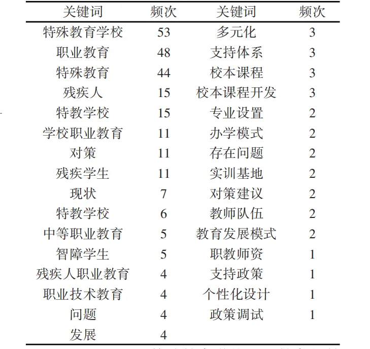 展、多元化、江苏省苏州市、特殊教育等。从关键词聚类可以看出,当前教师专业发展和特殊学生是研究者主要关注的内容,同时多元化、转型发展、特殊教育等也是研究者关注的重点内容。可能是由于研究者对关键词的定义标准不一致以及Citespace软件不够精确的原因,关键词聚类出现了与研究内容不太相关的聚类。值得关注的是,各关键词之间的同质性过高,说明研究的展开度不高,多学科研究仍有较大的可发掘空间。本文选取了关键词频次排名靠前的关键词(见表2),除去“特殊教育学校”和“职业教育”这两个文献检索词及同义词,综合考虑关键词出现的频次和关键词聚类图谱,再结合对文献的大量研读,分析得出特殊教育学校职业教育的研究重点,即教师、课程、政策。