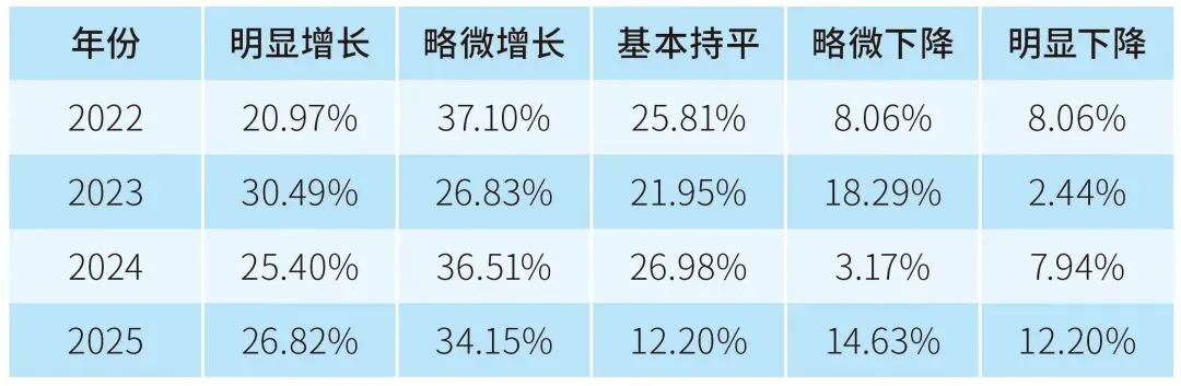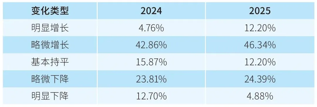 关于过去一年产值或销售额的变化,如表1所示,2025年情况有所恶化,“略微下降”和“明显下降”的比例在提高。但“明显增长”和“略微增长”的比例看上去也不错,“基本持平”的比例则有所下降;这反映市场出现两极分化状况,有竞争力的企业表现良好,缺乏竞争力的企业则面临困难。