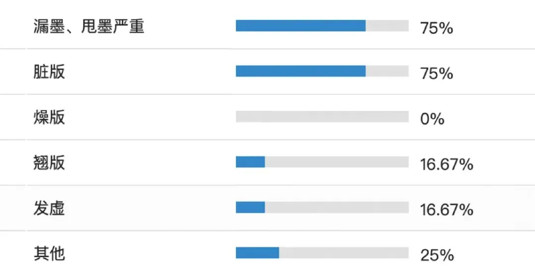 如图3所示,生产中遇到的最大困难是“换单太多,效率出不来”,这与前面提到的提升换单效率的重要性一致,另外,“生产中问题多,停机频繁”占比也很高。对此我们做了进一步调研,如图4所示,主要问题集中在“甩墨漏墨”和“脏版”两方面,占比都很高,此外还有印版垃圾、辊筒垃圾、设备稳定性等问题。整体来看,甩墨、漏墨和脏版是目前大家普遍认同的生产痛点。