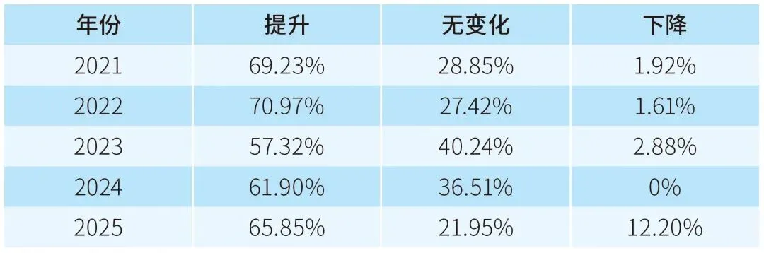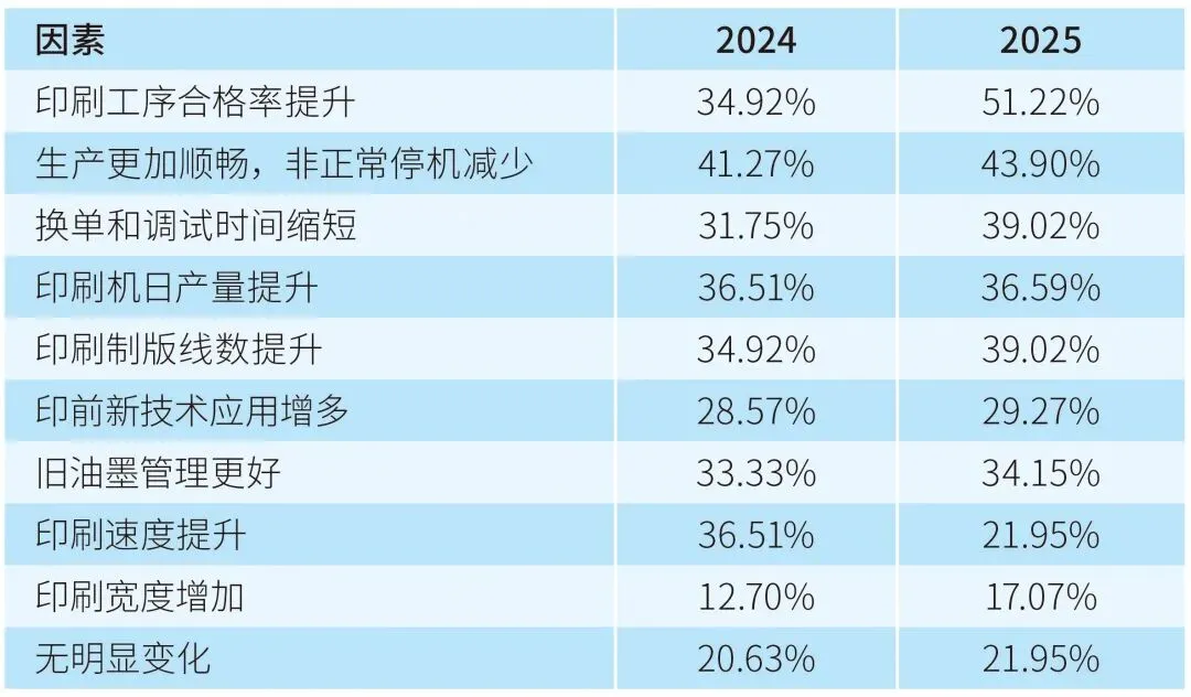 关于过去一年印刷质量的变化,如表3所示,2025年与过去四年的数据类似,约三分之二的受访者认为印得越来越好;但也有相当比例认为印刷水平有所下降,原因可能是客户要求提高,或同行进步更快,自身若跟不上就会显得下降。