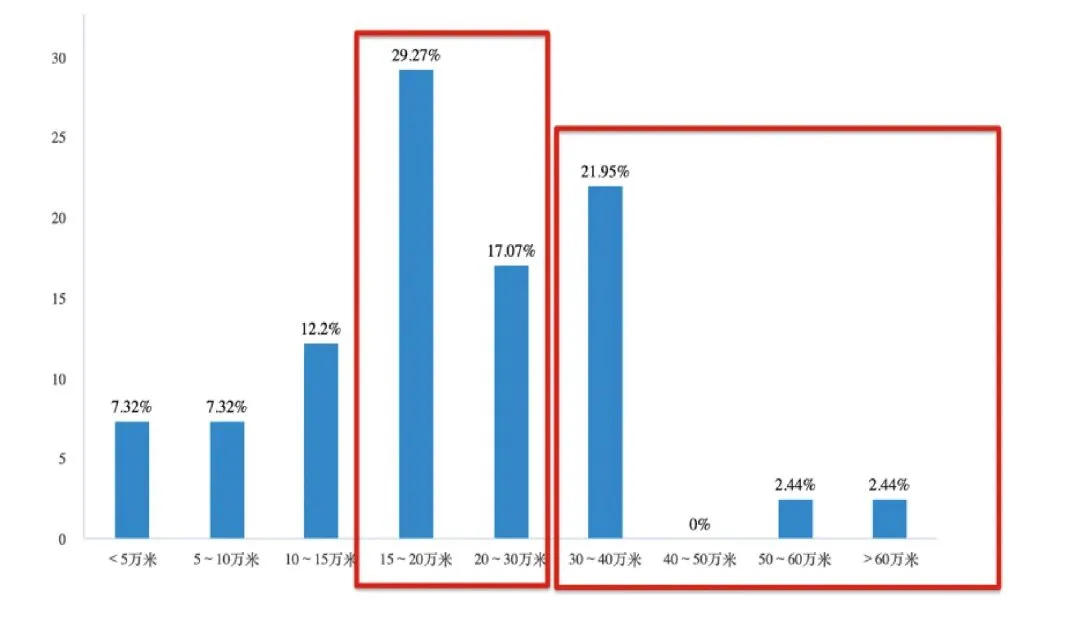2024年单台卫星式柔印机日均印刷米数的分布呈正态分布,而2025年分布(如图5所示)更为离散。高产能区间(如50~60万米以上)的企业增长明显。现场或电话回访其中几家企业,证实数据属实,这些企业的管理水平都已经达到或非常接近国外的顶级水平。