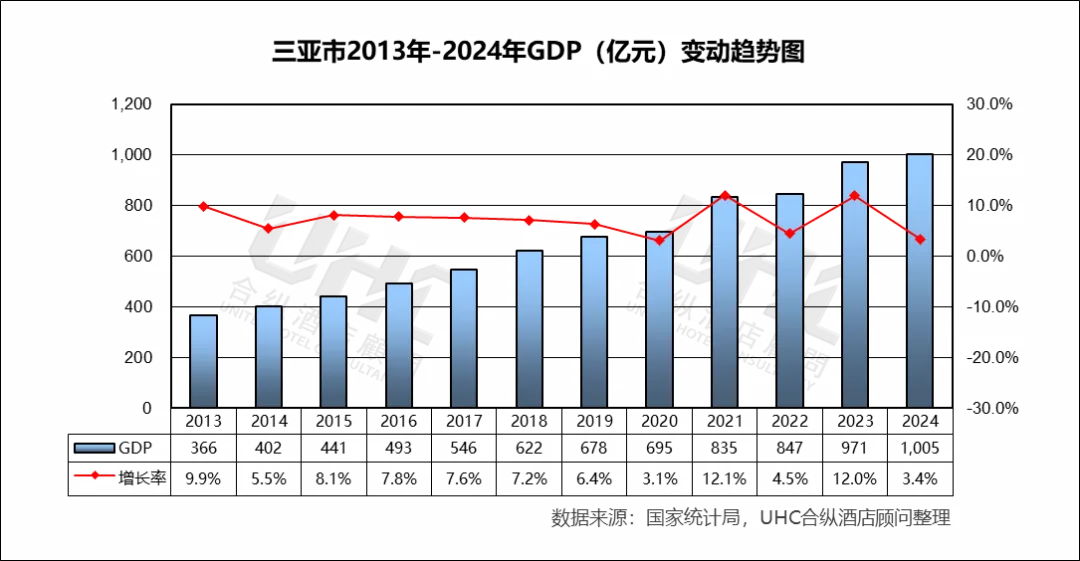 三亚市GDP从2013年的366亿元持续增长至2024年的1005亿元,实现了历史性的千亿跨越。2013-2019年间,GDP增速维持在6.4%-9.9%的稳健区间;受宏观环境影响,2020-2022年经历了明显的“波浪式”起伏。值得关注的是,2024年增速放缓至3.4%,这预示着经济增长动能正从“规模扩张”向“提质增效”的存量优化阶段转型。