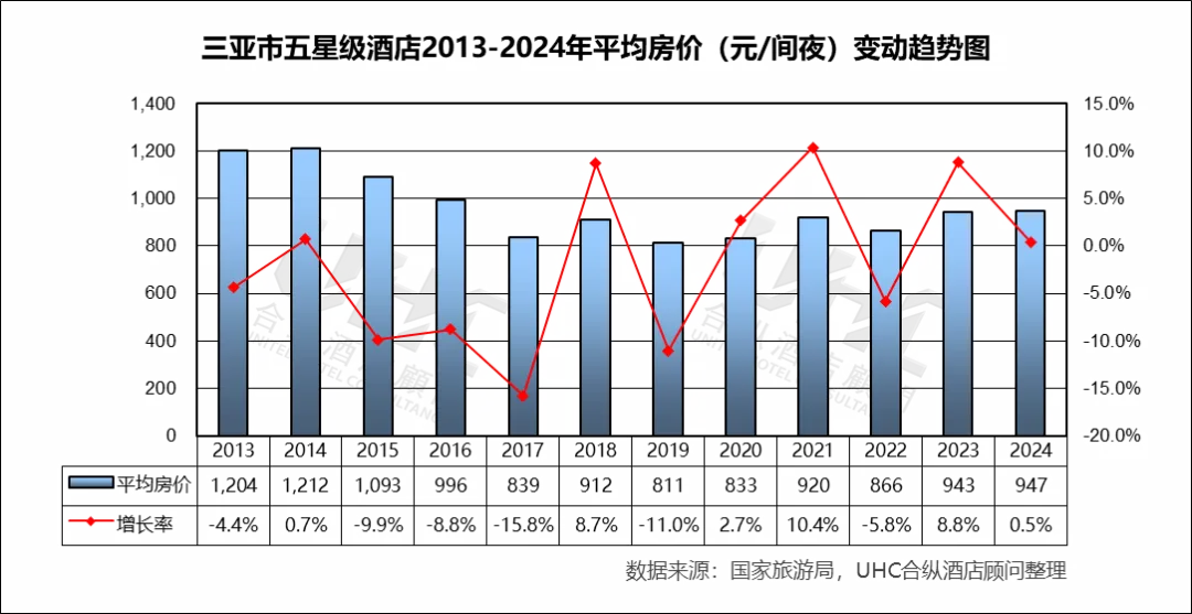 三亚市五星级酒店2013-2024年的平均房价为965元,其中最高为2014年的1212元,最低为2019年的811元。从变动情况来看,三亚五星级酒店房价在2013-2014年达到巅峰(1,212元/间夜),随后由于全岛酒店供给规模的快速扩张及旅游产品多元化,价格进入长期下行与重构期,至2019年探底至811元;2023年房价回升至943元,2024年微增0.5%达到947元,表明三亚高端酒店的价格体系已企稳。
