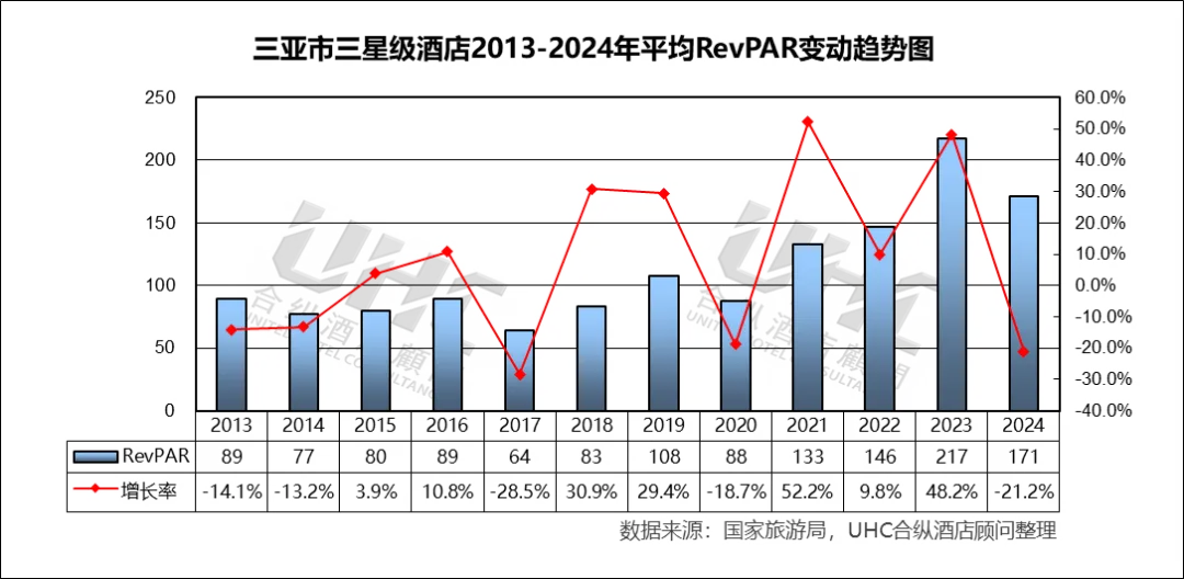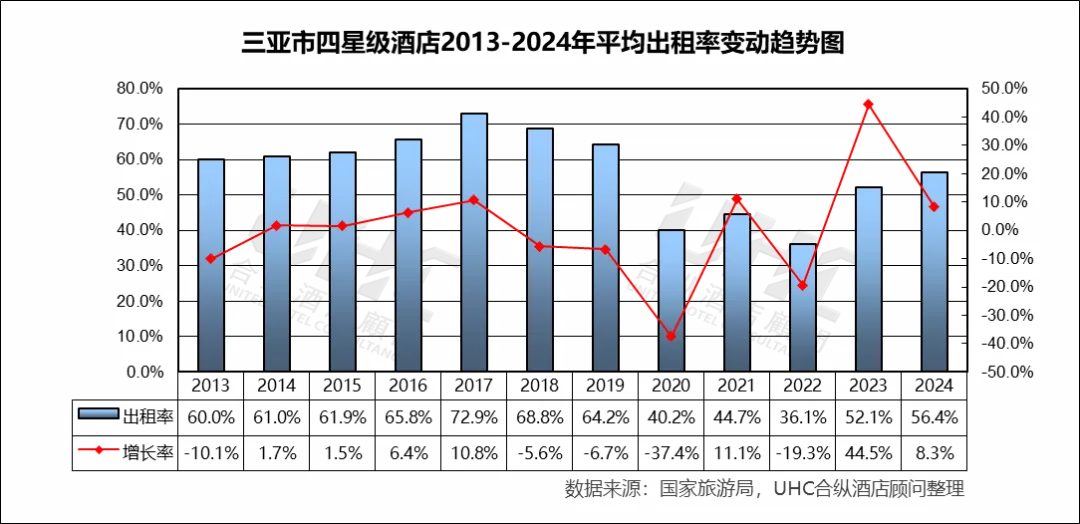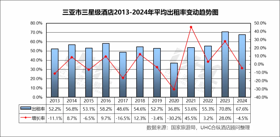出租率方面,2013-2024年的平均出租率为57.0%,其中最高为2017年的72.9%,最低为2022年的36.1%。从变动情况来看,在疫情前的2018-2019年,出租率已连续下滑,从 72.9% 的高点回落至 64.2%,显示市场在遭遇外部冲击前,内生增长动力已不足; 2020年出租率暴跌至 40.2%(-37.4%),2022年再次探至 36.1% 的谷底;尽管2023年出现显著反弹(+44.5%),但至2024年出租率仅恢复至 56.4%,与疫情前 65%-73% 的健康区间仍有 近10个百分点 的差距,这表明需求基础受损严重,市场未恢复至疫情前水平,复苏进程显著滞后于头部度假市场。