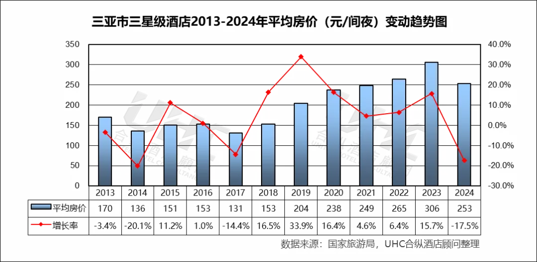 三亚市三星级酒店2013-2024年的平均房价为201元,其中最高为2023年的306元,最低为2017年的131元。从变动情况来看,房价在 131元 至 306元 的宽幅区间内剧烈震荡,年际增长率波动极大(如 -20.1% 至 +33.9%),这表明市场定价高度敏感且不稳定,可能受到新产品入市价格战、季节性营销策略、或客源结构剧变的影响。