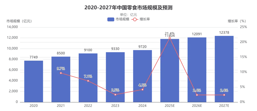 中国零食市场正处于高速增长阶段。根据艾媒咨询数据,2020年中国休闲食品市场规模为7749亿元,到2024年已增长至9330亿元,复合年增长率达4.8%[1]。另一份数据显示,2025年市场规模已突破1.18万亿元,预计2027年将达到1.24万亿元[2]。