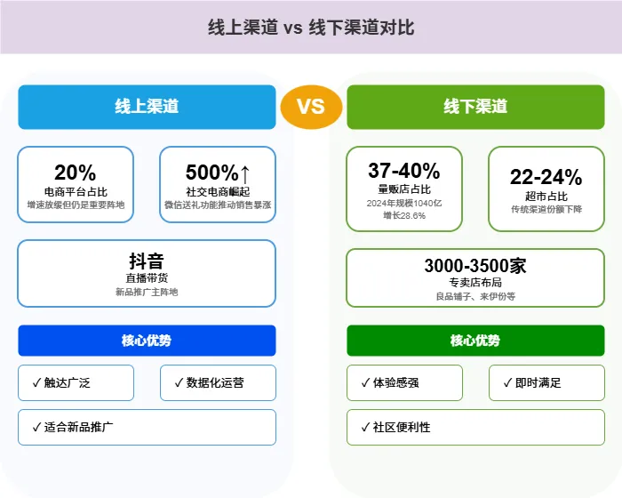 渠道创新释放增长红利线上渠道和新兴量贩店模式成为重要增长引擎。2025年春节期间,微信"送礼物"功能推出后,三只松鼠微信小店单日成交和拉新环比涨幅均达500%以上[3]。零食量贩市场规模从2019年的40.8亿元增至2024年的1040亿元,年复合增速高达104%[6]。