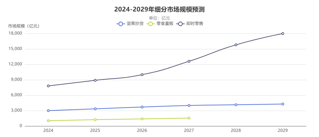 细分市场方面,坚果炒货市场规模预计2029年将达到4283亿元[14]。零食量贩市场规模预计2027年达到1547亿元[28]。即时零售规模预计2026年突破1万亿元,到2030年达到2万亿元[35]。
