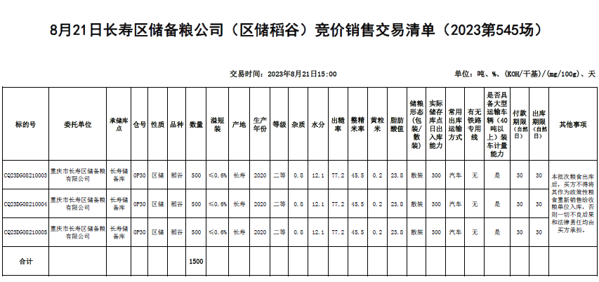 受重庆市长寿区储备粮有限公司委托,重庆市粮油批发市场有限责任公司(即国家粮食重庆交易中心,以下简称“批发市场”)定于2023年8月21日15:00举办长寿区储备粮公司(区储稻谷)竞价销售交易会,现将有关事项公告如下: