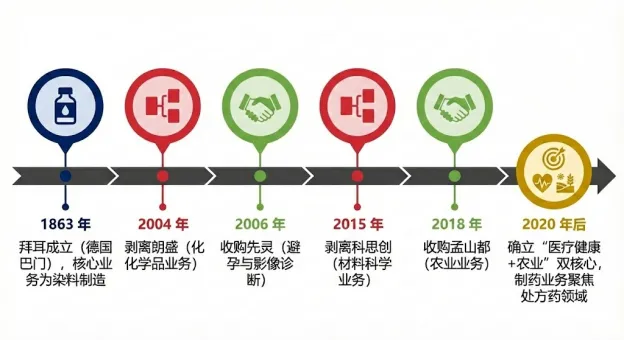 拜耳公司于1863年在德国巴门(Barmen)成立,起初是一家染料制造商。经过一个半世纪的演变,特别是通过剥离朗盛(Lanxess,化学品)和科思创(Covestro,材料科学),以及收购先灵(Schering,避孕与影像诊断)和默克(Merck & Co.,消费者健康部分业务),拜耳确立了其作为全球生命科学巨头的地位,聚焦于医疗健康农业两大支柱。