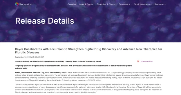 Recursion Pharmaceuticals合作:拜耳与Recursion深化合作,利用其AI驱动的操作系统进行高通量药物筛选,专注于纤维化疾病和肿瘤。拜耳成为Recursion大模型LOWE的首批Beta用户,旨在通过AI大幅缩短靶点发现周期