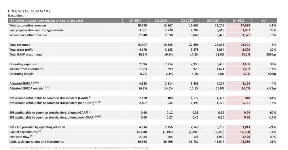 昨天看特斯拉2025年财报,数字挺吓人:交付量少了近9%,汽车收入跌了10%,净利润直接腰斩,连Model S和X都停产了。但奇怪的是,股票没跌,反而涨了4%,市值还在1.4万亿上面晃。没人急着抛,好像这些下滑早被算进去了。