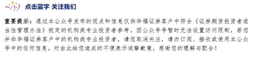 本公众号所载内容仅面向专业机构投资者,任何不符合前述条件的订阅者,敬请订阅前自行评估接收订阅内容的适当性。订阅本公众号不构成任何合同或承诺的基础,华福证券不因任何订阅或接收本公众号内容的行为而将订阅人视为本公司的客户。