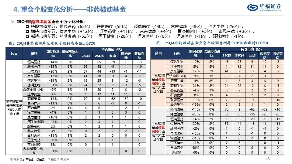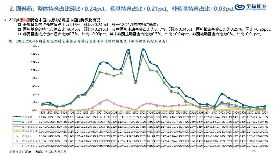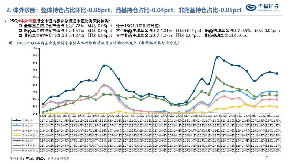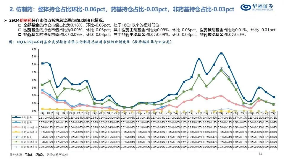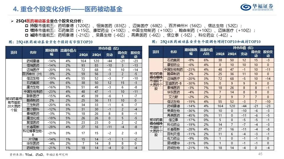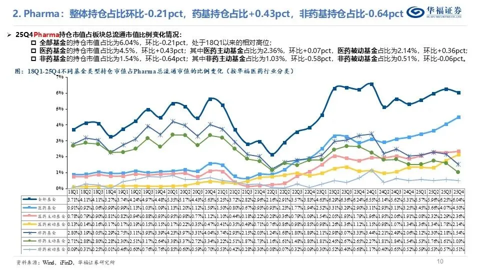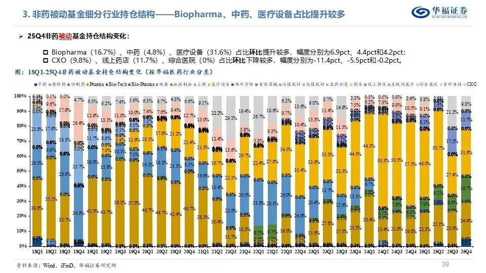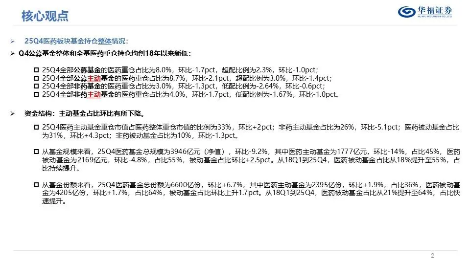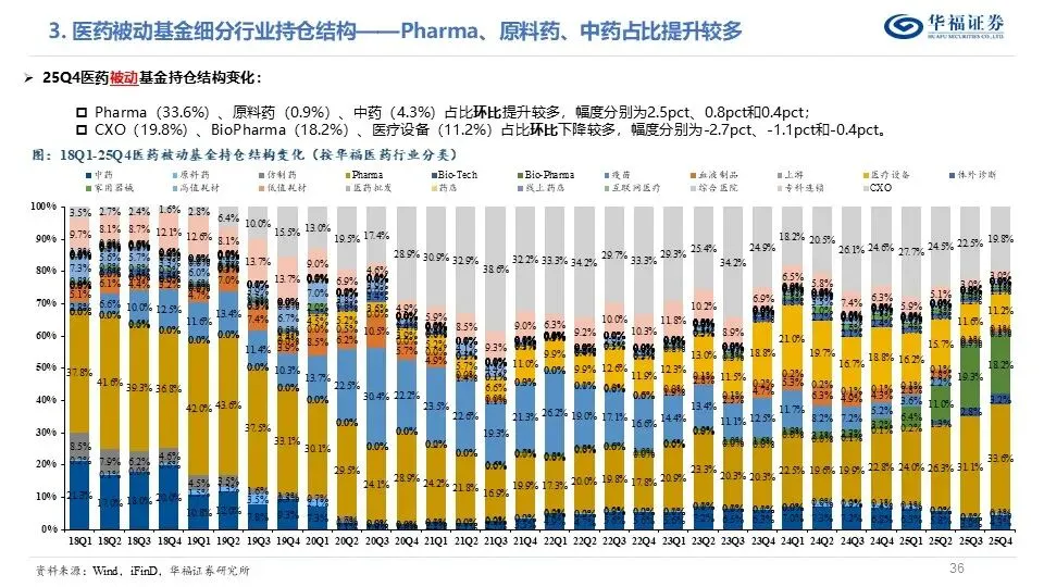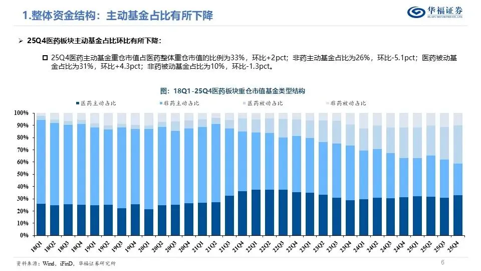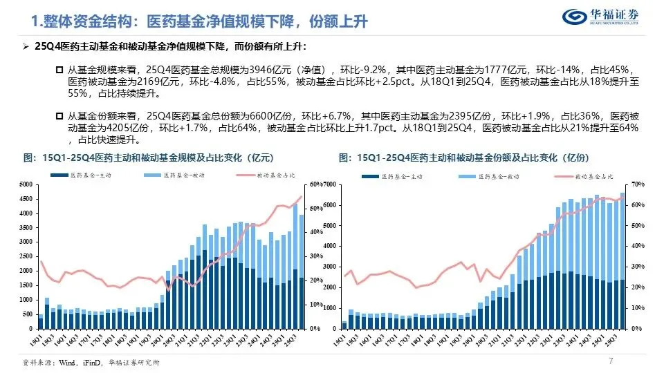 p从基金份额来看,25Q4医药基金总份额为6600亿份,环比+6.7%,其中医药主动基金为2395亿份,环比+1.9%,占比36%,医药被动基金为4205亿份,环比+1.7%,占比64%,被动基金占比环比上升1.7pct。从18Q1到25Q4,医药被动基金占比从21%提升至64%,占比快速提升。