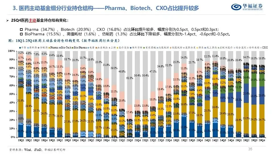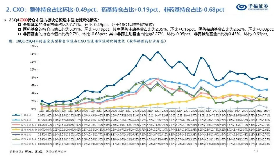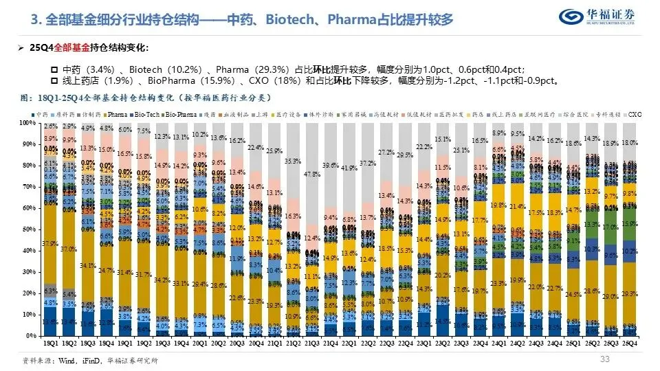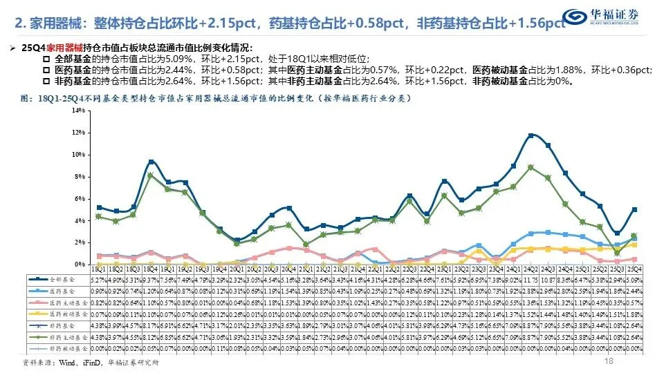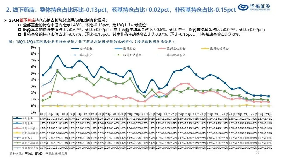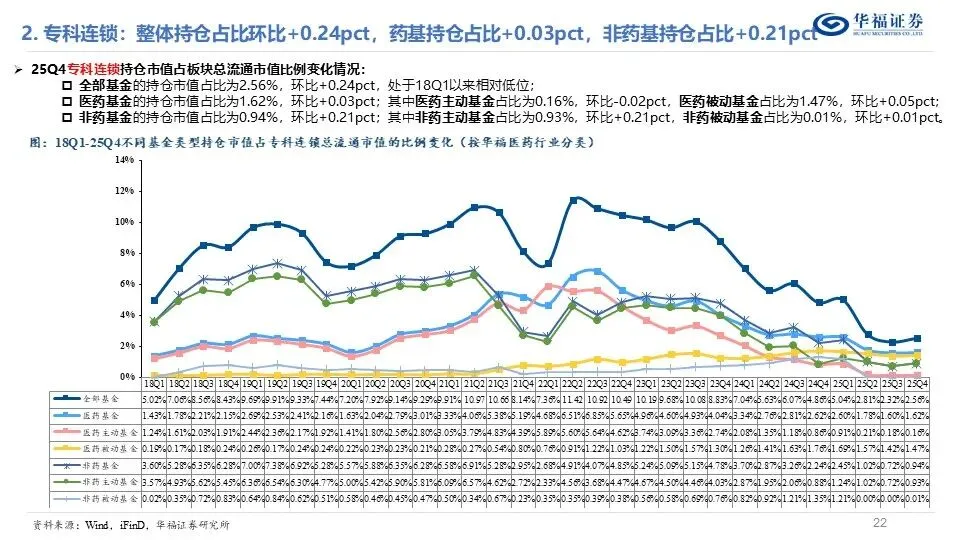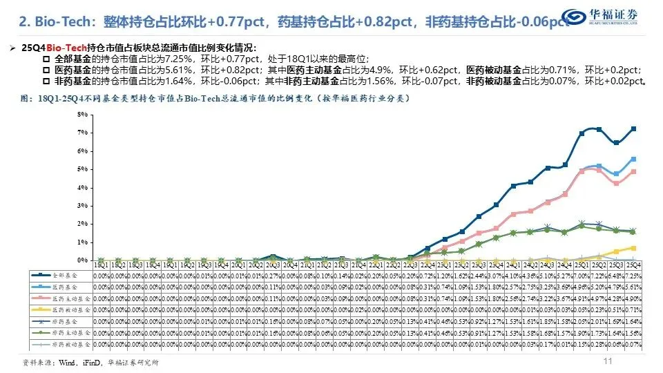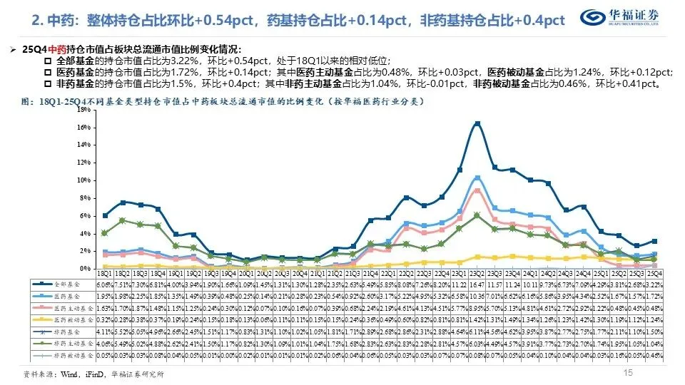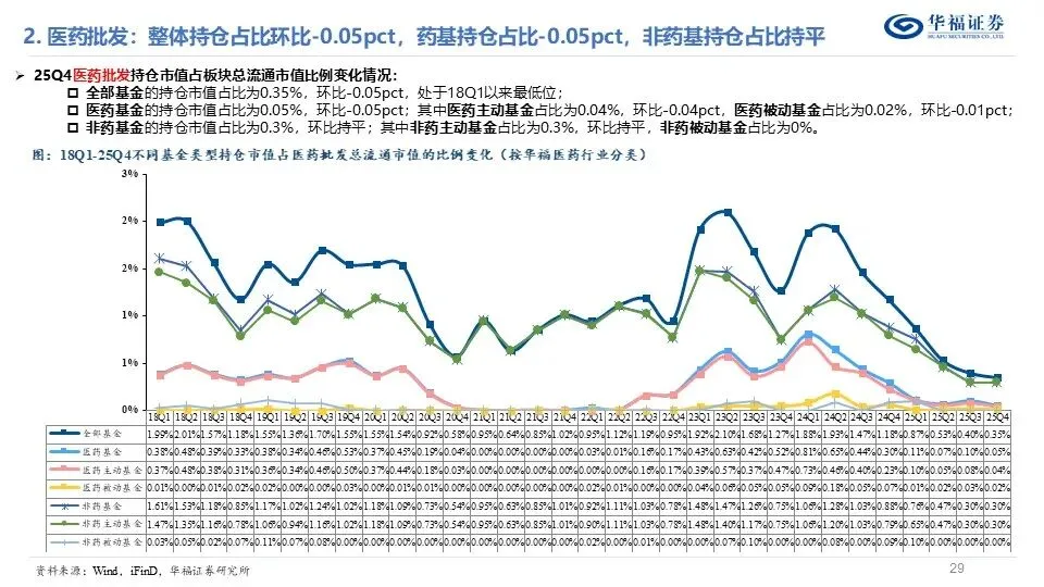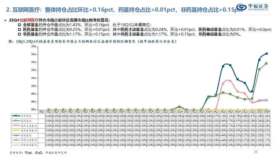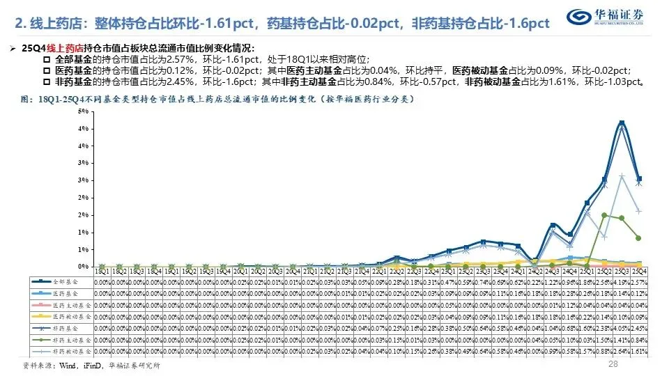 p从基金份额来看,25Q4医药基金总份额为6600亿份,环比+6.7%,其中医药主动基金为2395亿份,环比+1.9%,占比36%,医药被动基金为4205亿份,环比+1.7%,占比64%,被动基金占比环比上升1.7pct。从18Q1到25Q4,医药被动基金占比从21%提升至64%,占比快速提升。