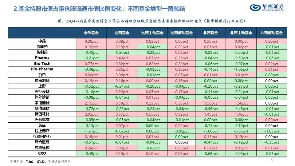 Ø25Q4不同基金类型医药持仓变化比较:药基中Pharma、中药占比提升较多,BioPharma、CXO占比下降较多,非药基中中药、医疗设备占比提升较多,Pharma、线上药店占比下降较多。