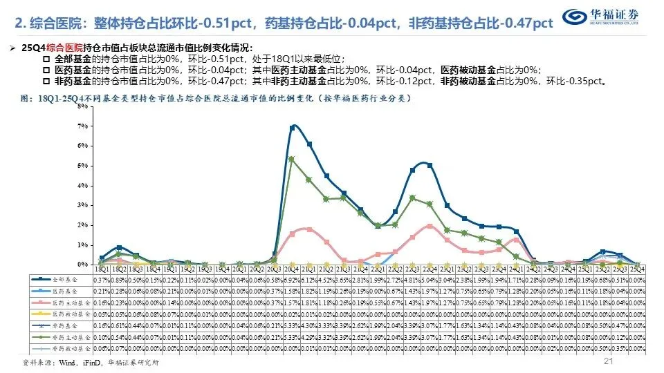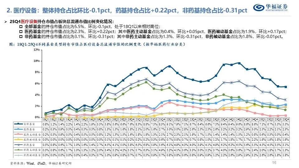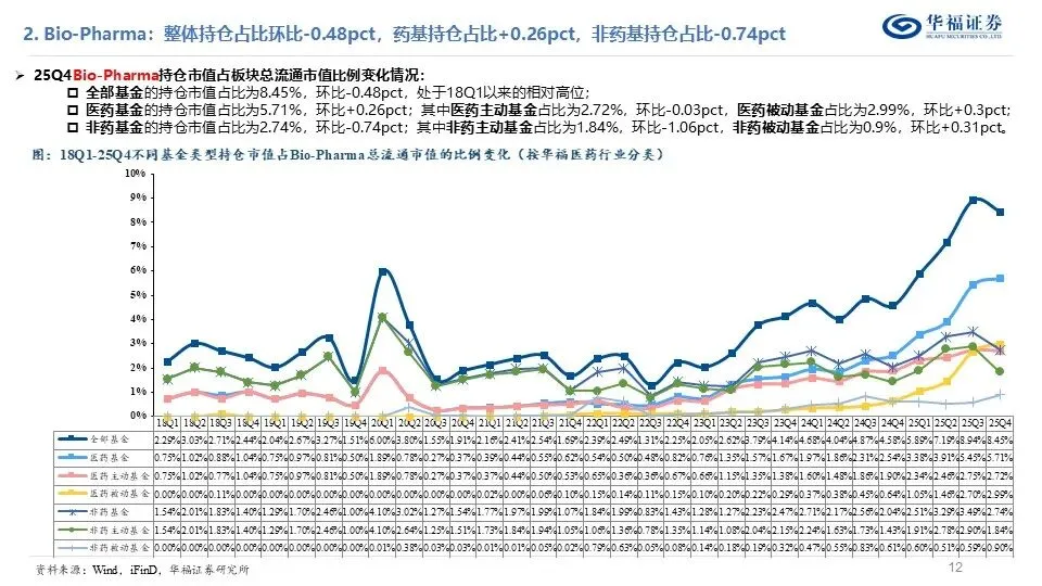 p从基金规模来看,25Q4医药基金总规模为3946亿元(净值),环比-9.2%,其中医药主动基金为1777亿元,环比-14%,占比45%,医药被动基金为2169亿元,环比-4.8%,占比55%,被动基金占比环比+2.5pct。从18Q1到25Q4,医药被动基金占比从18%提升至55%,占比持续提升。