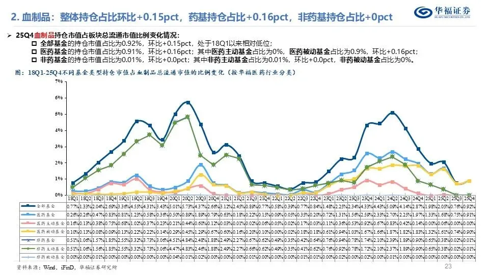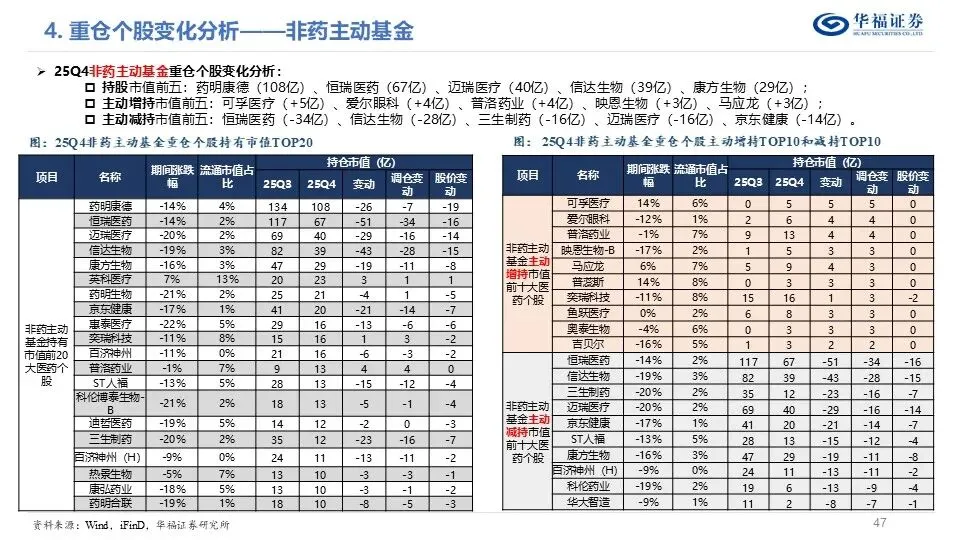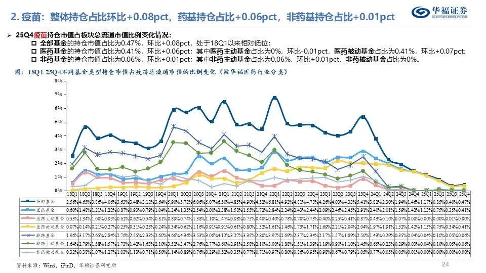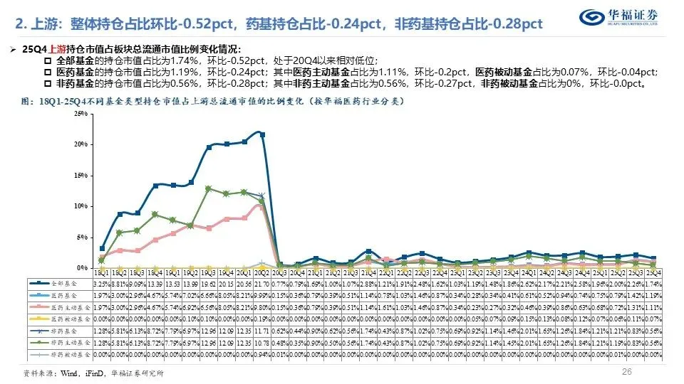 p25Q4医药主动基金重仓市值占医药整体重仓市值的比例为33%,环比+2pct;非药主动基金占比为26%,环比-5.1pct;医药被动基金占比为31%,环比+4.3pct;非药被动基金占比为10%,环比-1.3pct。