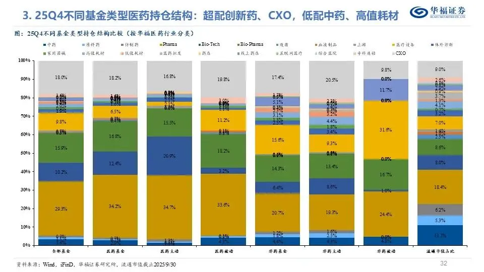Ø25Q4不同基金类型医药持仓结构比较:整体超配创新药、CXO,低配中药、高值耗材。
