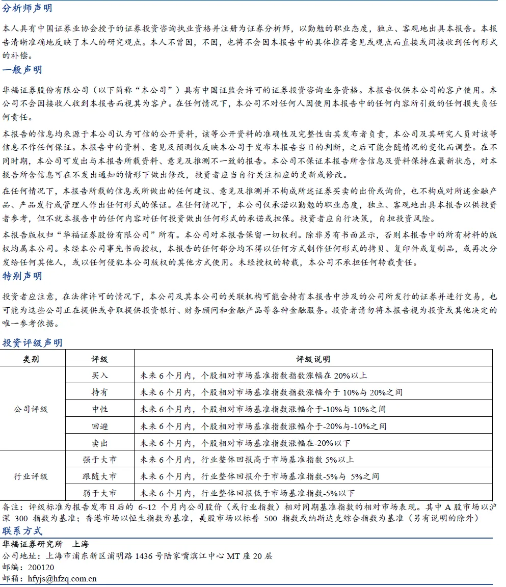 本公众号不是华福证券研究报告的发布平台,所载内容均来自于华福证券已正式发布的研究报告,订阅者若使用所载资料,有可能会因缺乏对完整报告的了解或缺乏相关的解读而对其中关键假设、评级、目标价等内容产生理解上的歧义。提请订阅者参阅华福证券已发布的完整证券研究报告,仔细阅读其所附各项声明、信息披露事项及风险提示,关注相关的分析、预测能够成立的关键假设条件,关注投资评级和证券目标价格的预测时间周期,并准确理解投资评级的含义。